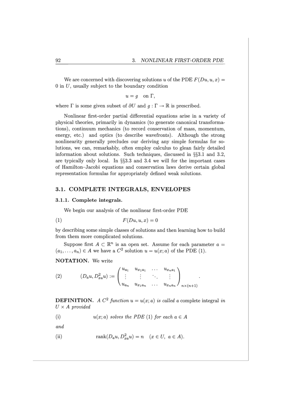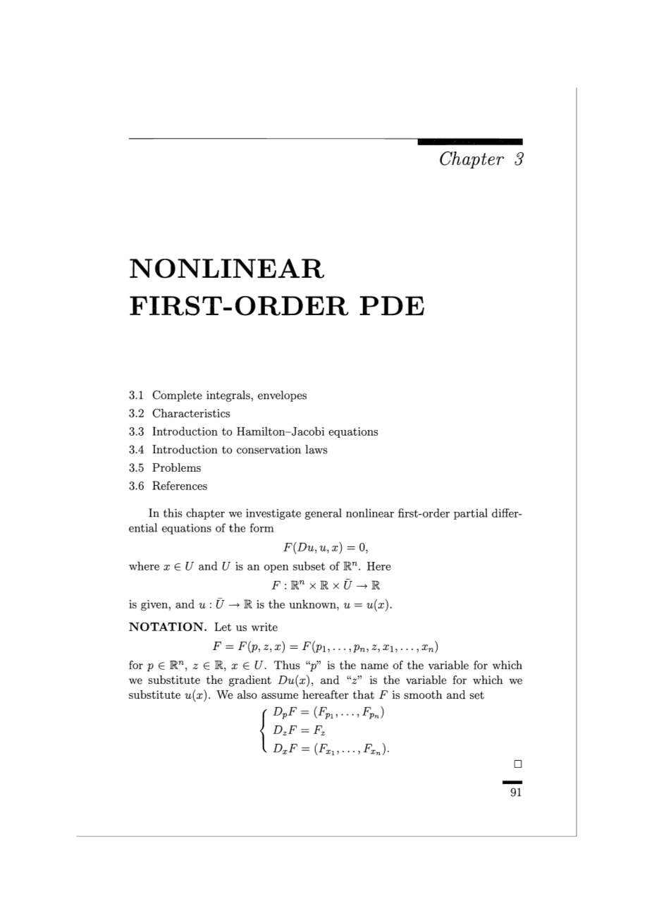 非线性一阶偏微分方程出现在各种物理理论中,主要是在动力学(产生典范变换)、连续介质力学(描述质量、动量、能量守恒等)和光学(描述波前)中。尽管强非线性性质通常使我们无法推导出任何简单的解析公式,但值得注意的是,我们常常可以利用估计计算来收集关于解的相对详细的信息。在sect;sect;3.1和3.2中讨论的这种技术通常只是局部的。在sect;sect;3.3和3.4中,我们将对Hamilton-Jacobi方程和守恒律的重要情况,推导出适当定义的弱解的某些全局表示公式。