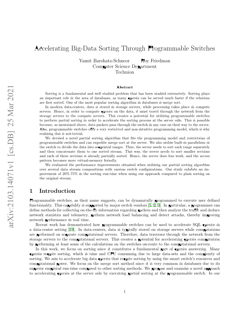 我们设计了一种新的部分排序算法,适合可编程开关的编程模型和限制,可以加快服务器上的合并排序。我们还利用交换机中内置的并行性来将数据划分为顺序范围。因此,服务器需要分别对每个范围进行排序,然后将它们连接到一个已排序的流中。这样,服务器就需要对较小的部分进行排序,并且每个部分都已经进行了部分排序。因此,服务器所做的工作更少,并且访问模式变得对虚拟内存更加友好。