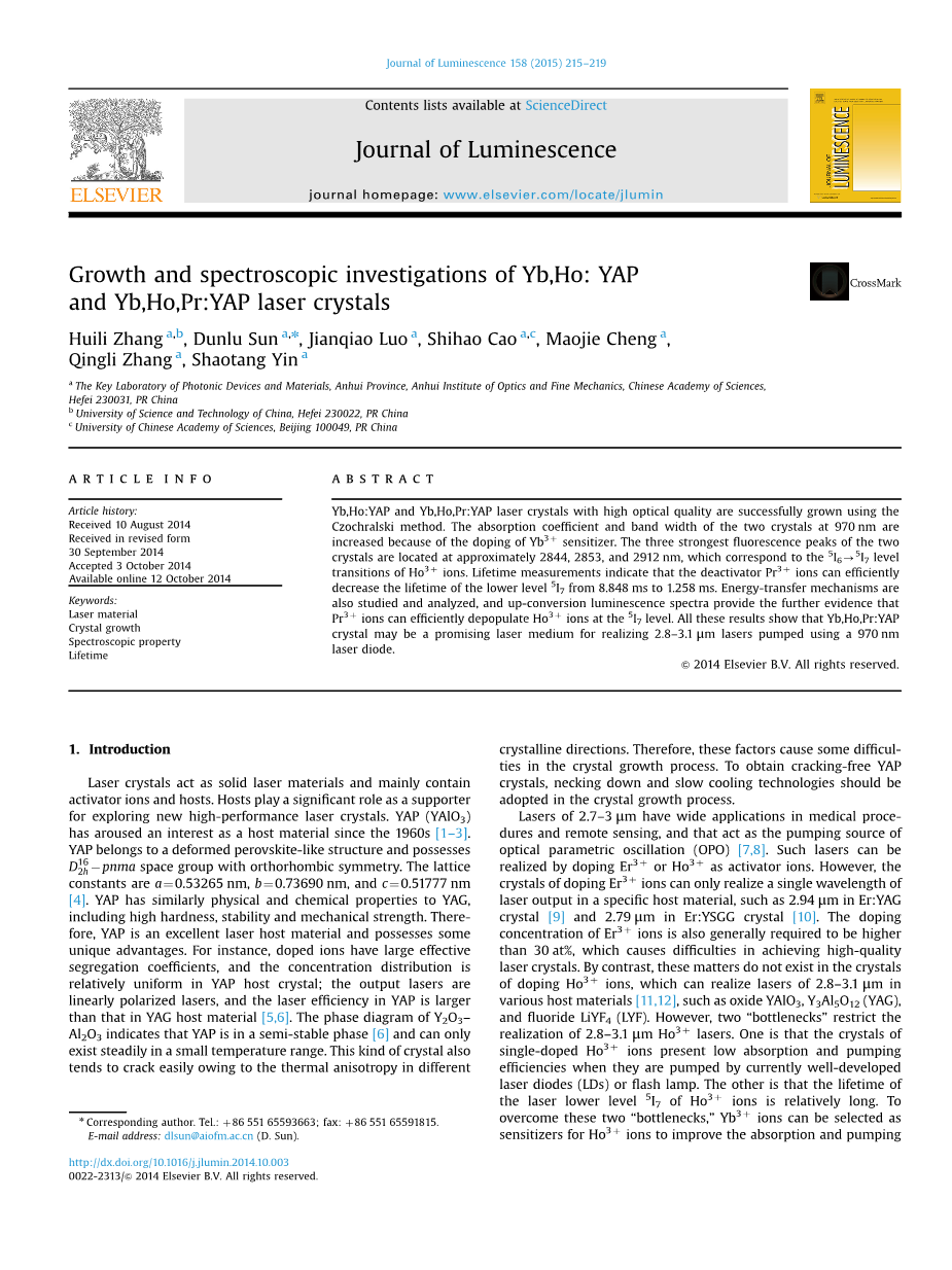 Yb,Ho:YAP和Yb,Ho,Pr:YAP激光晶体具有高光学质量,可使用提拉法生长。由于敏化剂Yb3 的掺杂,两种晶体在970 nm处的吸收系数和带宽增加。这两个晶体的三个最强的荧光峰大约位于2844,2853和2912 nm处,这对应于Ho3 的5I65I7能级跃迁。寿命测量表明,失活剂Pr3 可以有效地将能级5I7的寿命从8.848 ms降低到1.258 ms。根据能量转移机制进行了研究和分析,发现Pr3 可以有效地减少5I7能级上的的Ho3 离子,并且上转换发光光谱同样提供了进一步的证据。所有这些结果都表明,Yb,Ho,Pr:YAP晶体可能是用于实现使用970 nm激光二极管泵浦的2.8-3.1 mu;m激光的较有前景的激光介质。