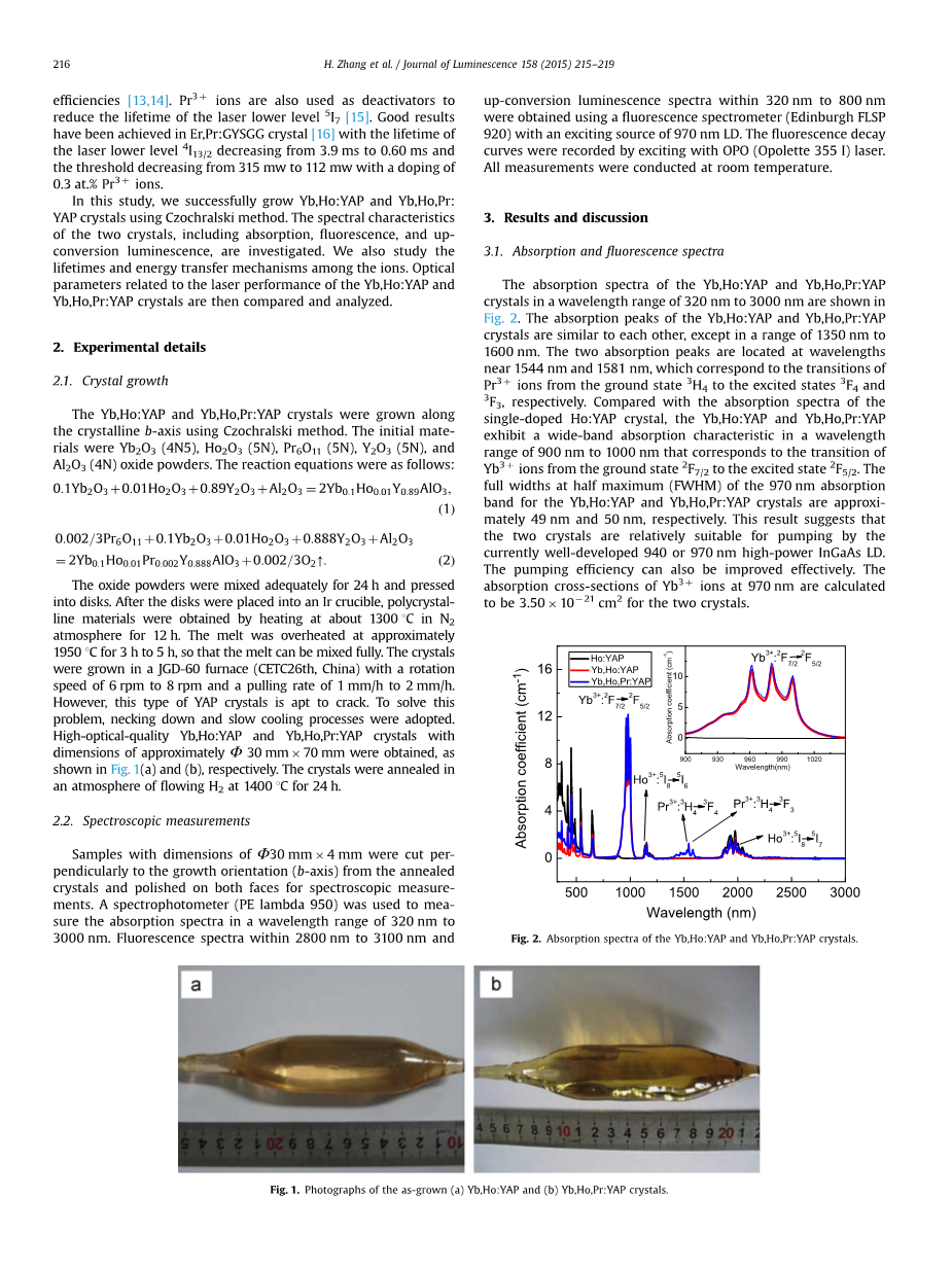 在垂直于退火晶体的生长方向(b轴)切割尺寸为Phi;30mm4mm的样品,并在两面进行抛光以进行光谱测量。使用分光光度计(PE lambda 950)来测量在320 nm至3000 nm的波长范围内的吸收光谱。当激发光源为970 nm 的激光二极管时,使用荧光光谱仪(Edinburgh FLSP 920)获得2800 nm至3100 nm内的荧光光谱和320 nm至800 nm内的上转换发光光谱。用OPO(Opolette 355 I)激光激发记录荧光衰减曲线。(所有测量均在室温下进行)
