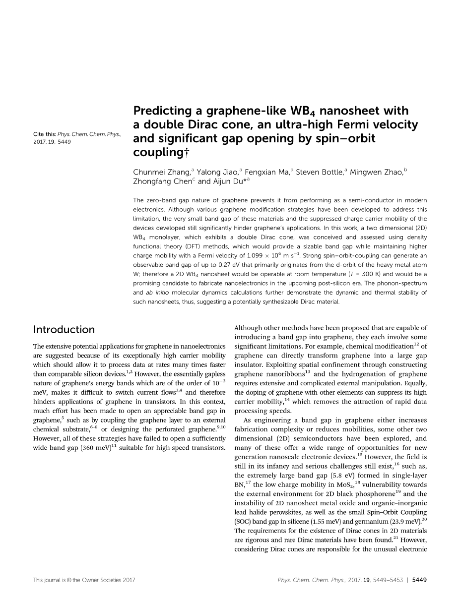 石墨烯的零带隙特性使它在现代电子中无法充当半导体。尽管已经开发了各种石墨烯修饰策略来解决这个问题这些材料的带隙很小,器件的载流子迁移率受到抑制,这仍然严重阻碍了石墨烯的应用。在这项工作中,一个二维的(2D)WB4单分子层表现为双Dirac锥,采用密度泛函理论(DFT)方法对其进行了设计和评估,该方法在保持较高的代办的同时提供了相当大的带隙。e迁移率,费米速度为1.099times;106 m s-1。强自旋轨道耦合可以产生一个可观测的带隙高达0.27 eV,主要来源于重金属原子的d轨道。因此,在室温(T=300 K)条件下,2D WB4纳米片具有良好的可操作性,有望在后硅时代制备纳米电子器件。声子谱从头算的分子动力学计算进一步证明了这种纳米材料的动态和热稳定性,从而表明了一种可能合成的Dirac材料。