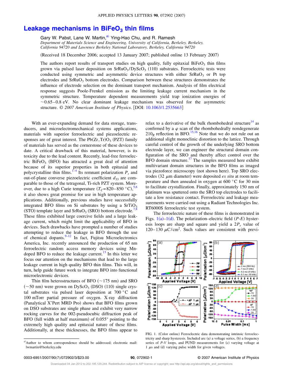 With an ever-expanding demand for data storage, trans- ducers, and microelectromechanical systems applications, materials with superior ferroelectric and piezoelectric re- sponses are of great interest. The Pb(Zr, Tr)O3 (PZT) family of materials has served as the cornerstone of these devices to date. A critical drawback of this material, however, is its toxicity due to the lead content. Recently, lead-free ferroelec- tric BiFeO3 (BFO) has attracted a great deal of attention because of its superior properties in both epitaxial and polycrystalline thin films.1–4 Its remnant polarization Pr and out-of-plane converse piezoelectric coefficient d33 are com- parable to those of the tetragonal, Ti-rich PZT system. More- over, due to a high Curie temperature (TC = 820 – 850 ° C),it also shows great promise for use in high t
