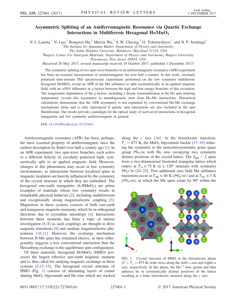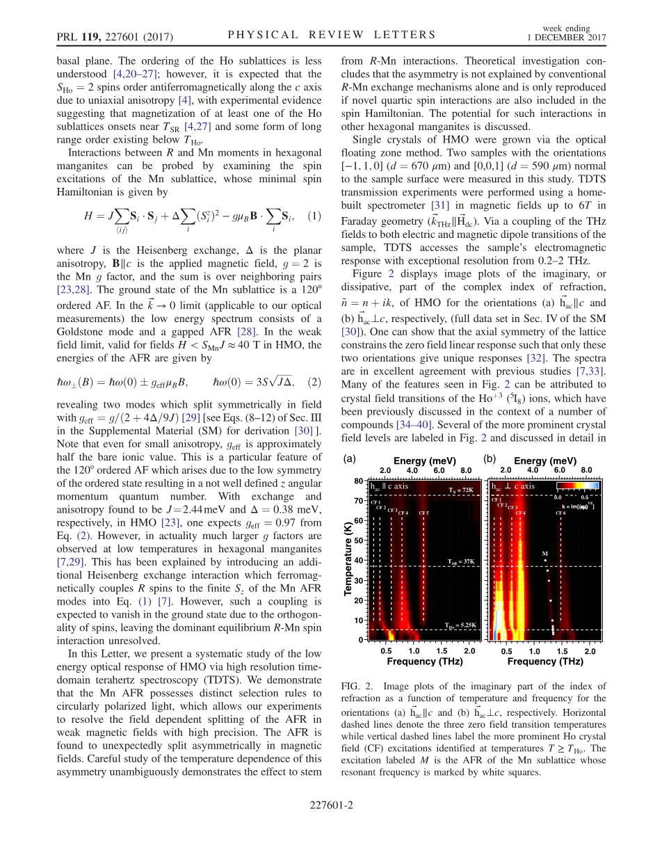 自从半个世纪前Kittel最早描述以来,反铁磁共振(AFR)一直是反铁磁性最重要的性质[1]。在AFR实验中,两个自旋波分支各自对圆偏振光的不同螺旋性起作用,在施加的磁场中对称分裂。然而,这种现象的变化可能发生在低对称环境中,因为磁绝缘体中局部自旋之间的相互作用很大程度上受到它们嵌入其中的晶体结构的对称性的影响。六方稀土亚锰酸盐(h-RMnO3)是低对称性导致显着物理性能的材料的主要例子[2],包括多铁性和特别强的磁电耦合[3]。这些系统中的磁性由稀土锰磁矩组成,这些磁矩由于晶体各向异性而位于正交方向[4]。这些时刻之间的相互作用一直是一个激烈的调查的主题[4-8],因为这种耦合被认为是驱动磁转变[9]和介导磁电现象[10,11]。然而,R-Mn自旋之间的交换机制仍然难以捉摸,因为它们的正交性表明在平衡自旋构型中比常规相互作用少海森堡交换。