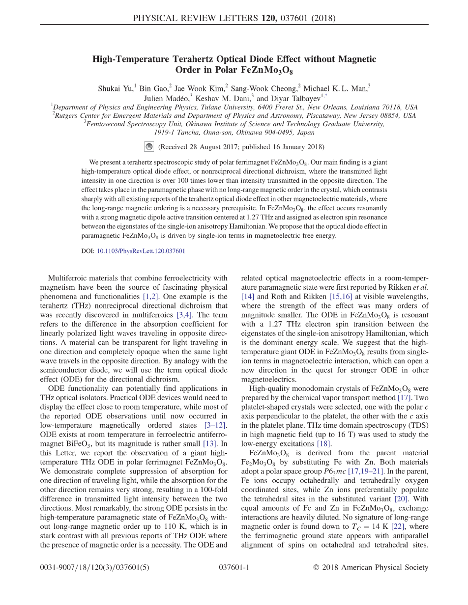 Shukai Yu,1Bin Gao,2 Jae Wook Kim,2Sang-Wook Cheong,2Michael K. L. Man,3 Julien Madeacute;o,3 Keshav M. Dani,3and Diyar Talbayev1,*,