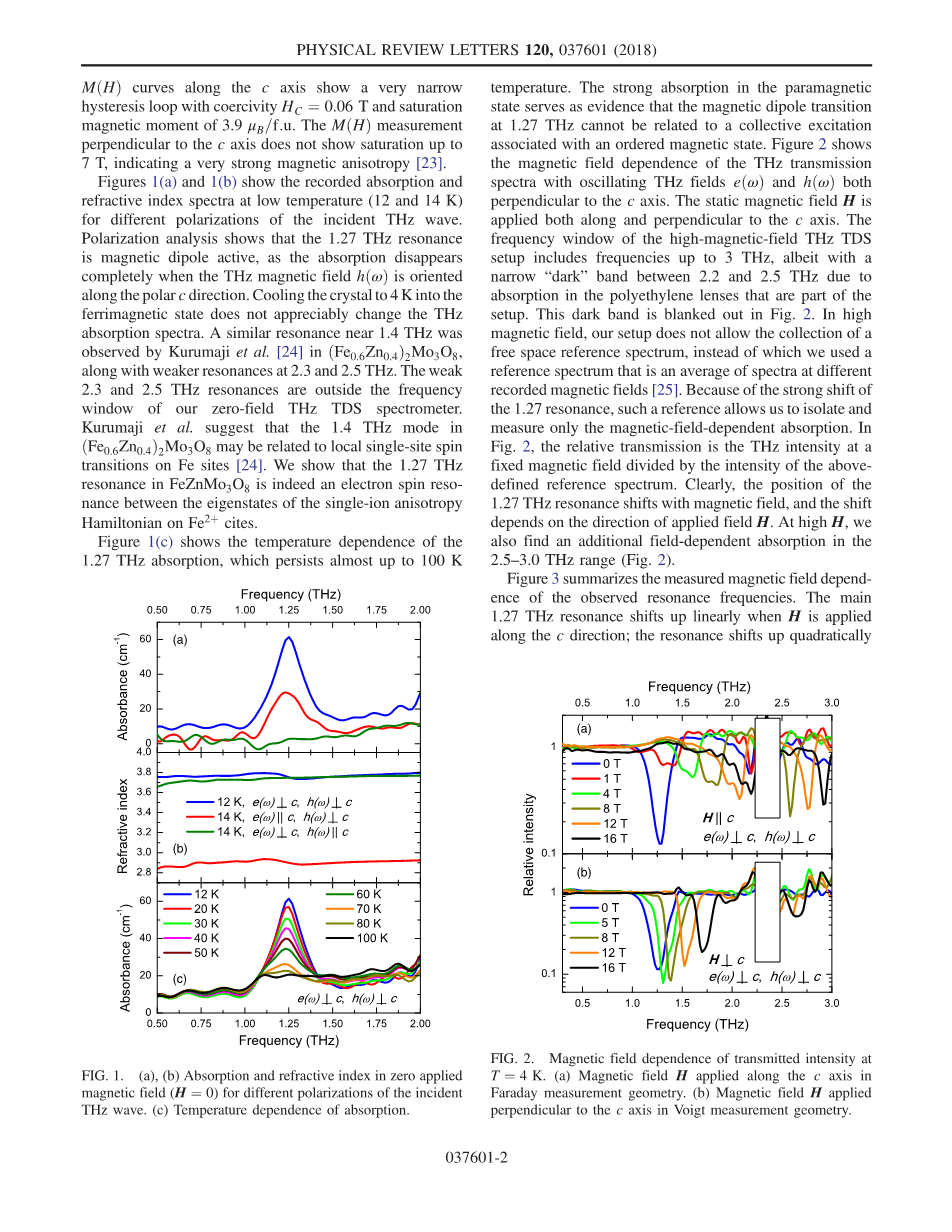 Fig.1(a)(b)对于入射的THz波的不同极化,在零施加的磁场(H = 0)下的吸收和折射率。 (c)吸收的温度依赖性。