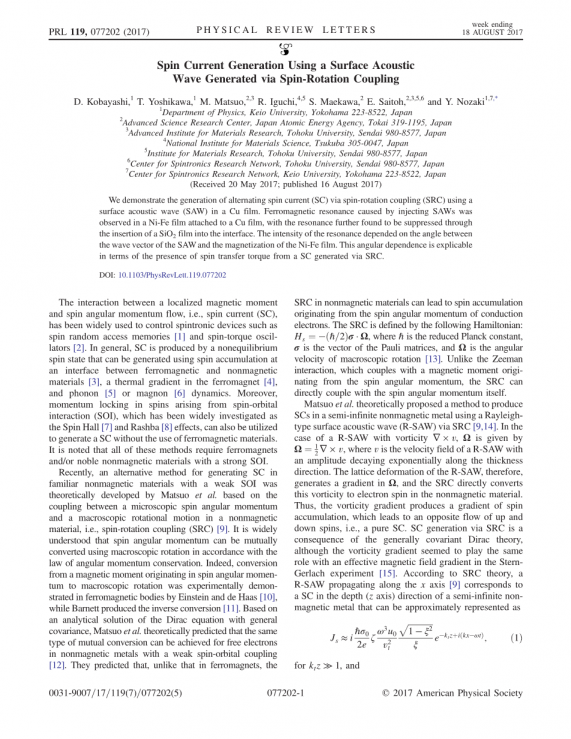 D.Kobayashi, T.Yoshikawa, M.Matsuo, R.Iguchi, S.Maekawa, E,saitoh, and Y.Nozaki