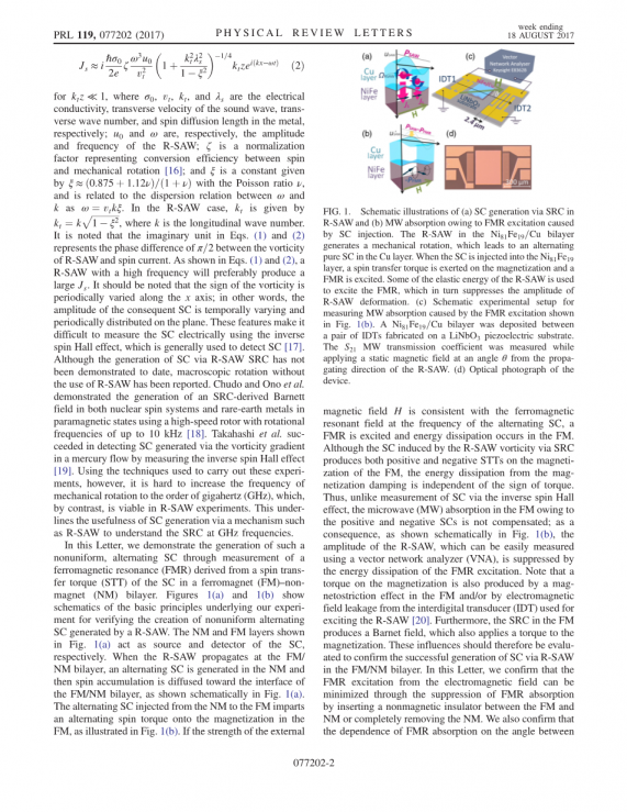 在铜膜中,我们证实了利用声表面波(SAW),可以通过自旋旋转耦合(SRC)来产生交变自旋流(SC)。在铜膜上再加一层Ni-Fe膜之后,由于声表面波的作用,会在铁磁层(Ni-Fe)中产生铁磁共振,而在两层材料的界面处插入一层 SiO2会抑制共振。同时发现了共振的强度对声表面波波失和Ni-Fe层磁化强度夹角的依赖关系,这种依赖关系可以通过自旋流的自旋转移力矩来解释。