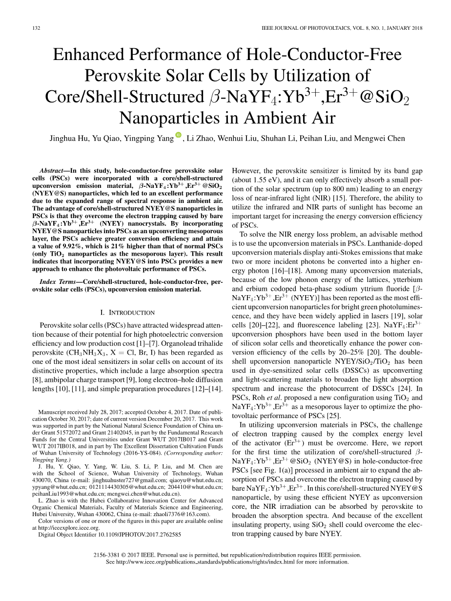 关键词 - 核/壳结构,无孔洞导体,perskovite太阳能电池(PSCs),上转换发射材料。