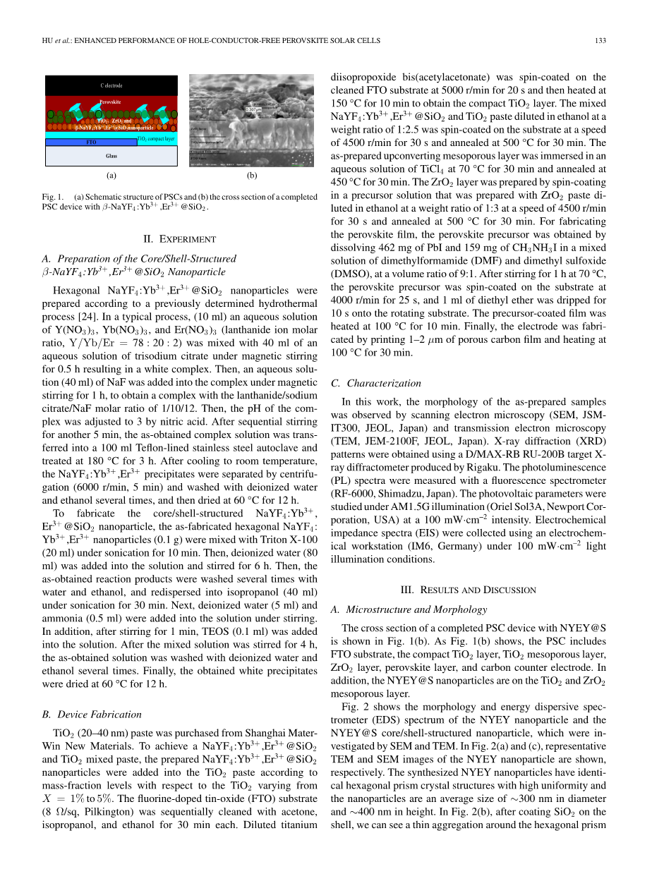 在利用PSCs中的上转换材料时,必须克服由活化剂(Er3 )的复杂能级引起的电子俘获的挑战。在这里,我们首次报道了在空气中处理的无空穴PSC [见图1(a)]中核/壳结构的beta;-NaYF4:Yb3 ,Er3 @ SiO2(NYEY @ S)以扩大PSCs的吸收,并克服裸露的NaYF4:Yb3 ,Er3 引起的电子俘获。在这种核/壳结构的NYEY @ S纳米粒子中,通过使用这些有效的NYEY作为上转换核心,NIR辐射可被钙钛矿吸收以扩大吸收光谱。由于绝缘性能优异,使用SiO2壳可以克服裸NYEY引起的电子俘获现象。