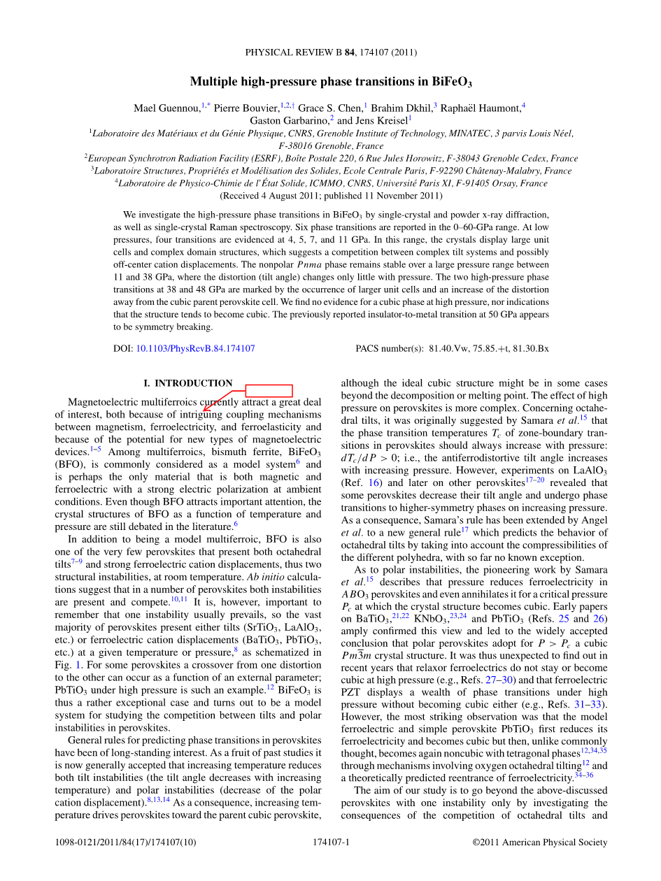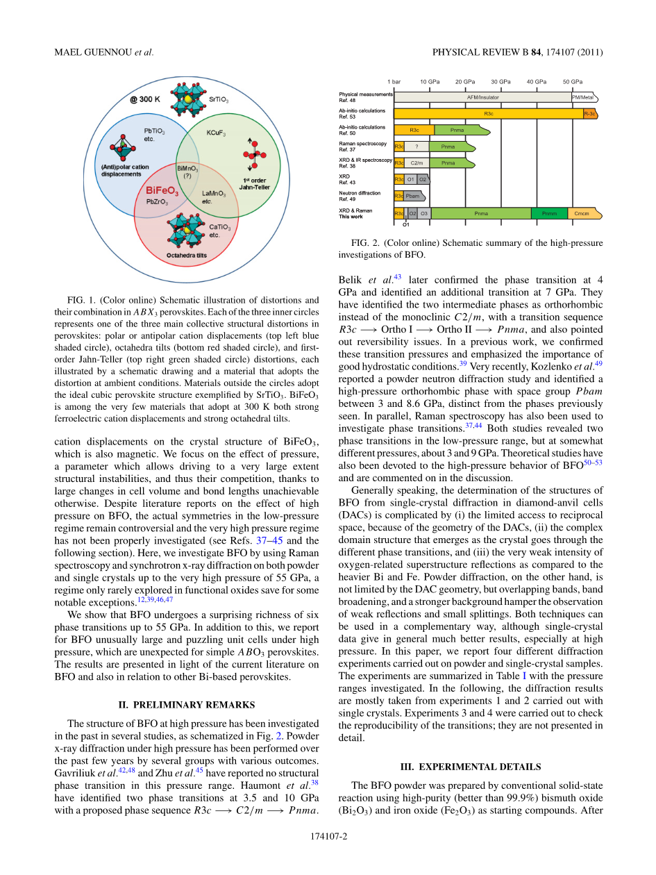 我们的研究的目的是仅通过调查八面体倾斜的竞争的结果和在同样具有磁性的BiFeO3晶体结构中的阳离子位移超越以上讨论的钙钛矿具有的一个不稳定性。我们专注于压力的影响,这是一个参数,它允许在很大程度上驱动结构的不稳定性,因此它们的竞争要多亏了晶胞体积和键长的大变化,否则无法实现。尽管文献报道高压对BFO的影响,但在低压系统中的实际对称性仍然存在争议,并且超高压系统还没有得到适当的研究(参见参考文献37 - 45和以下部分)。在这里,我们利用拉曼光谱和同步X射线衍射研究高达55GPa的超高压力下BFO粉末和单晶,这是一个仅在功能氧化物中被探索的罕见体系,除了一些明显的例外。