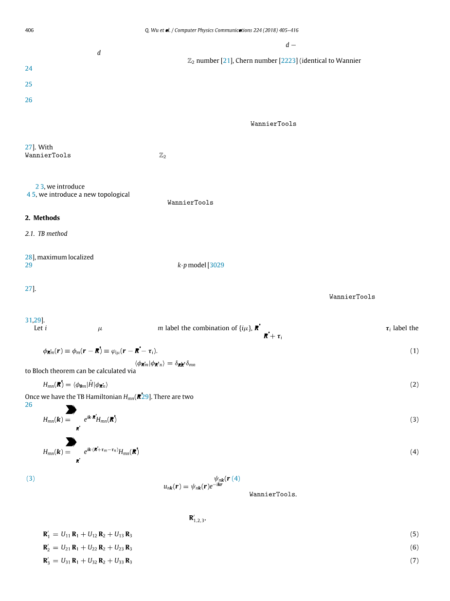 拓扑数[21]和Chern数[22]分别用于对时间反转不变性和时间反转对称破坏系统的拓扑性质进行分类。在反演对称不变系统中,Z2拓扑数可以通过将布里渊区中的时间反转不变矩(TRIMs)上的占据带的奇偶性乘以[32]来计算。有几种方法[33,23,24]用于计算反对称破坏系统中的数。其中,证明了威尔逊环[23]和Wannier电荷中心(WCC)[24]方法彼此等效,并且对于时间反转对称中断系统也有效。在WannierTools中,我们采用Refs中介绍的算法。[24,25]。混合WF [34]定义为