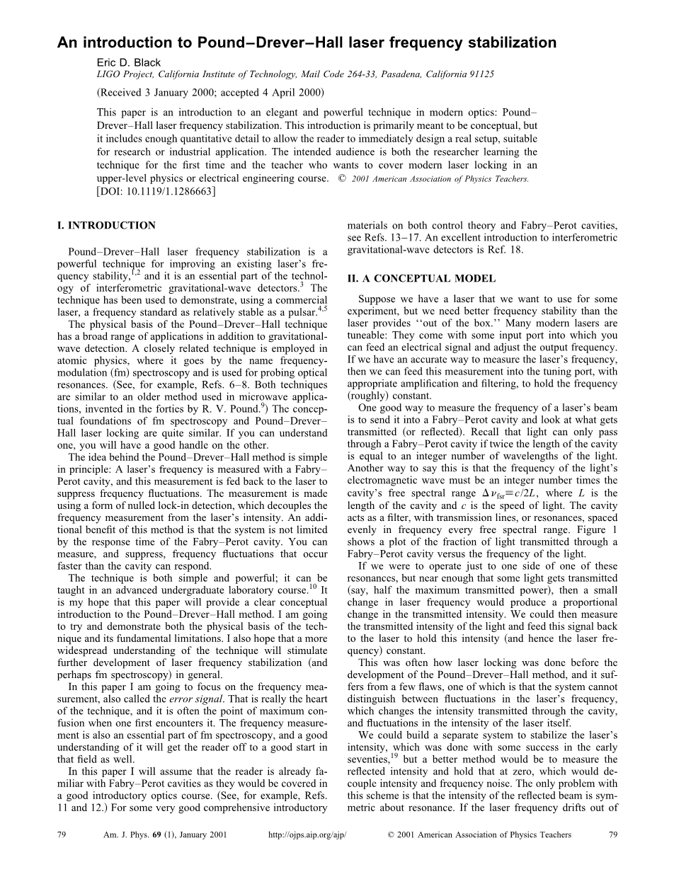 这项技术不仅简单而且很强大;它可以在一门本科高级实验课程中讲解。10我希望这篇文章可以对PDH方法提供一个清晰的概念简介。我打算讲解技术的物理基础和它根本上的限制。我同样希望对技术更广泛的理解将会促进激光频率稳定(或者可能是调频光谱学)更长远的发展。