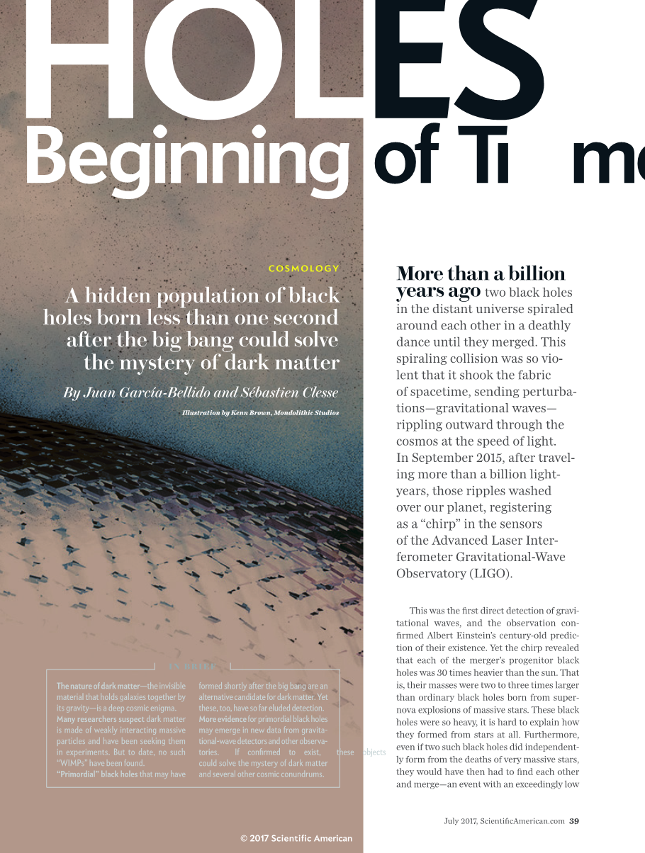 这样的黑洞群有着足够的密度来解释LIGO的神秘黑洞合并现象,不然就不会有规律来解释该现象的发生。在一个群中两个原初黑洞的轨道有时会发生交叉,从而两者会因引力结合在一起。而后它们会在数百万年间绕彼此螺旋旋转,同时辐射出引力波,直到合并。在2015年1月我们就已经预测到LIGO将会探测到这样的大质量合并发出的引力波——也就是当年晚些时候LIGO探测到的那些引力波。我们关于原初黑洞群内的黑洞合并速率的估计与LIGO提出的范围完全吻合。如果几年之内LIGO和其他设备能够探测到更多的合并事件,那么就有可能确定所有原始黑洞的质量和角动量。这种对黑洞合并事件的统计分析能够为探测它们的潜在的原始起源提供至关重要的信息。