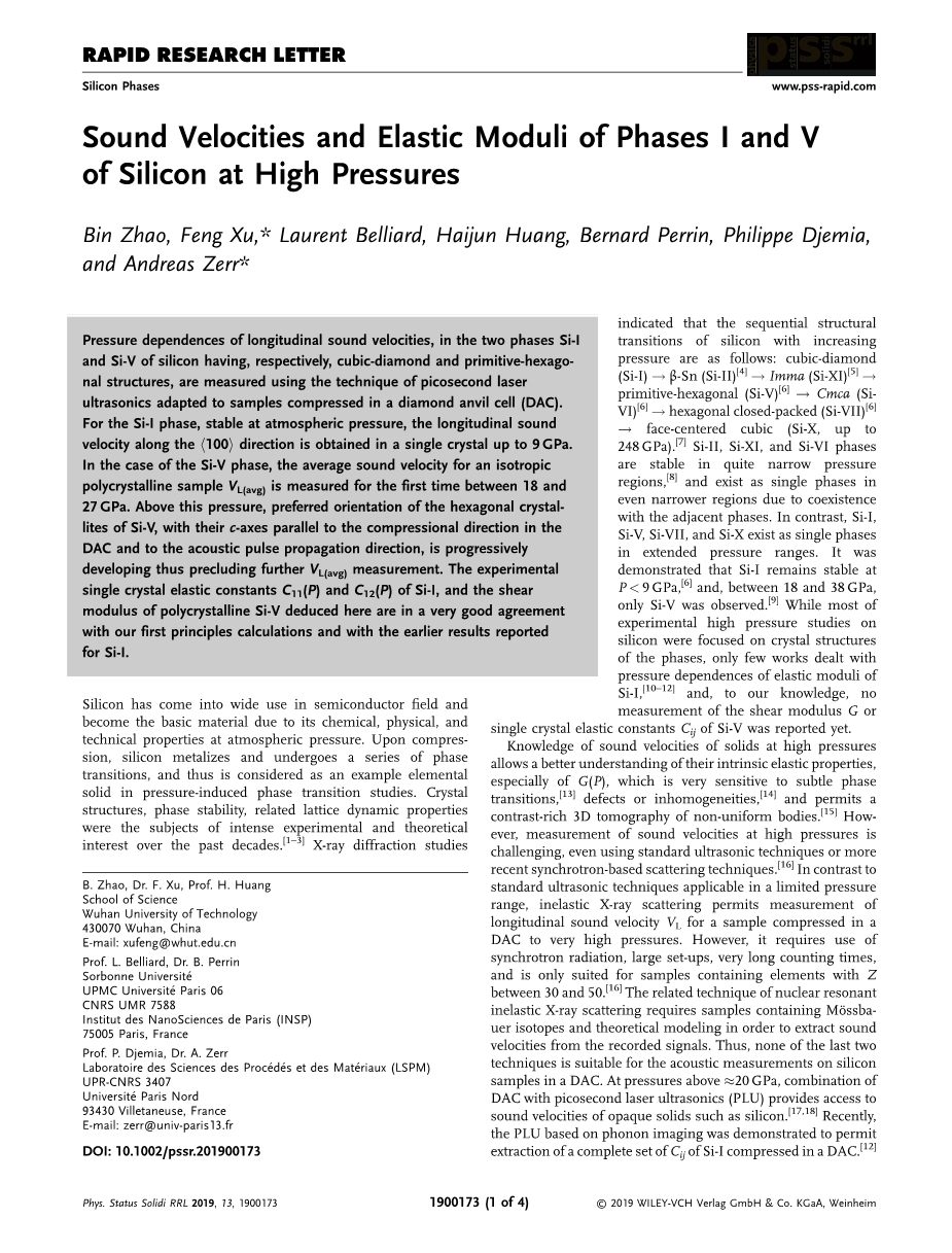 文献采用皮秒激光超声技术,测量了金刚石压腔(DAC)中压缩样品的纵波声速随压强的变化关系。实验对较低压强下具有立方结构的Si-I相和较高压强下具有简单六方结构的Si-V相进行了研究。对于Si-I相,实验测量了0~9 GPa压强范围内单晶硅中沿晶向上的纵波声速。在Si-V相中,我们首次测量了在18~27 GPa压强范围内各向同性多晶状态下样品的平均声速。随着压强进一步的增高,由于具有简单六方结构的Si-V相晶粒会出现择优取向,从而阻碍了进一步的的测量,这些晶粒的c轴平行于DAC的压缩方向和声脉冲传播方向。本文推导出的Si-I相在不同压强下单晶弹性常数和与先前报道的Si-I相的结果非常一致;多晶状态下的Si-V相的剪切模量与我们利用第一性原理计算的结果吻合得很好。