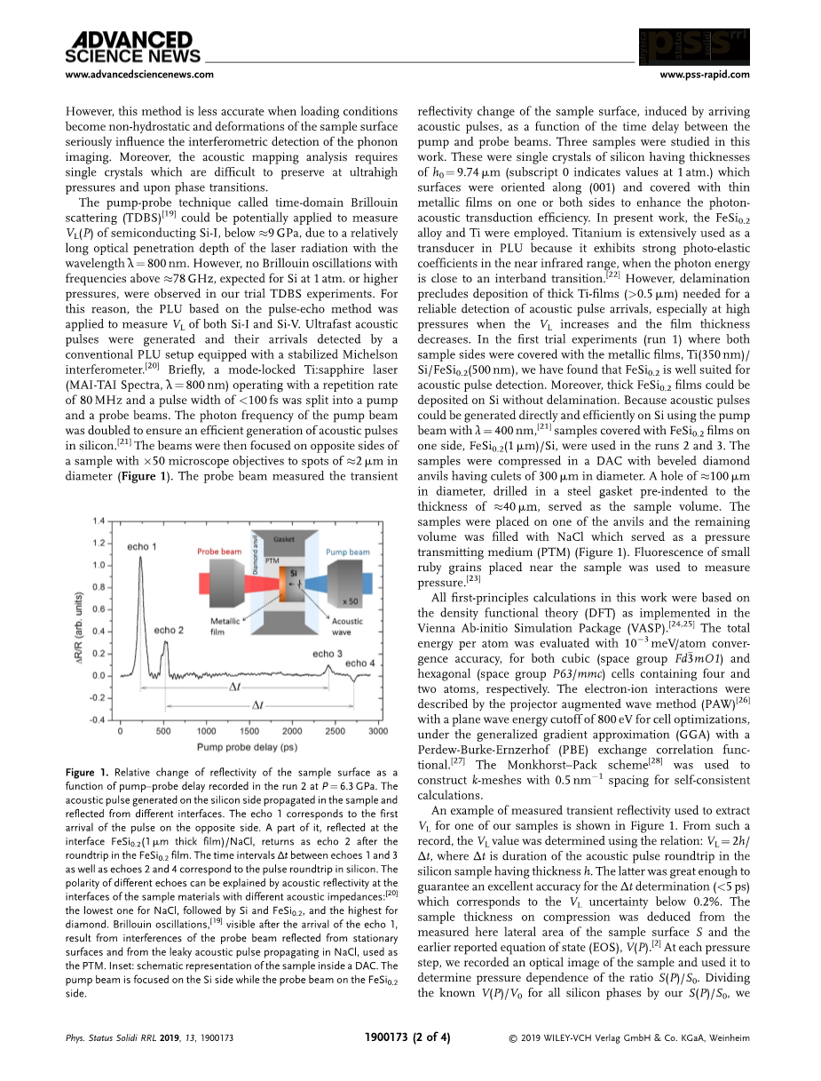 了解固体在高压下的声速可以更好地理解其固有的弹性特性,特别是G(P),它对细微的相变、缺陷或非均匀性非常敏感,并允许对非均匀体进行富对比度的三维断层扫描。然而,即使使用标准的超声波技术或更先进的同步辐射散射技术,在高压下测量声速也是具有挑战性的。相比标准超声技术适用于有限的压力范围,非弹性X射线散射允许测量压缩在DAC中非常高的压强下样品的纵波声速。然而,它需要使用同步辐射、大的设置以及非常长的计数时间,并且只适用于含有Z在30到50之间的元素的样品。核共振非弹性X射线散射的相关技术需要含有Mouml;ssba-uer同位素的样品和理论模型,以便从记录的信号中提取声速。因此,最后两种技术都不适用于DAC中硅样品的声速测量。当压强超过20 GPa时,DAC与皮秒激光超声(PLU)相结合可以获得不透明固体(如硅)的声速。最近,基于声子成像的PLU被证明可以提取一套完整的压缩在DAC中的Si-I相的弹性常数。然而,当加载条件变为非静水状态,且样品表面的变形严重影响声子成像的干涉检测时,这种方法的精度较低。此外,声学映射分析需要单晶,这些单晶在超高压和相变条件下很难保存。