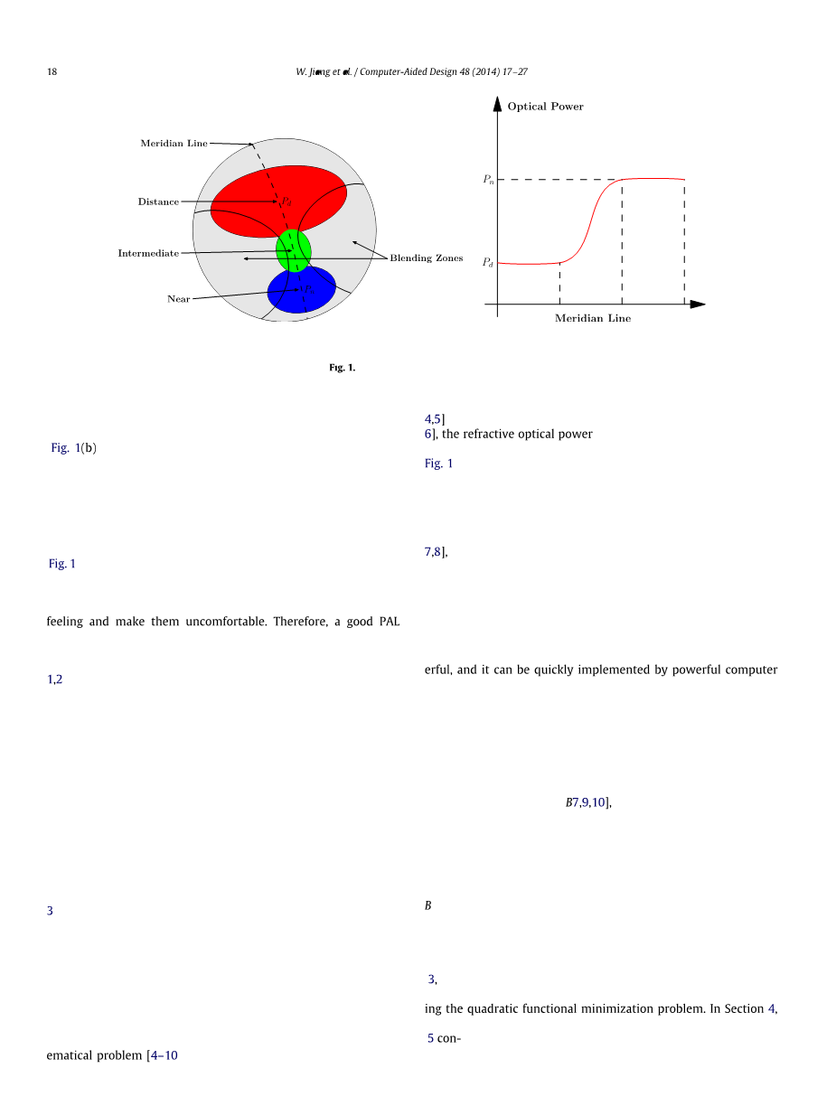对于本文讨论的PAL,将背面选择为具有恒定平均曲率的球形表面。因此,根据公式(1.2),通过平滑且逐渐地改变前表面的平均曲率,可以实现PAL 的光焦度P的渐进式变化。在本文中,设计目标是确定PAL前表面的形状。为简便起见,光焦度P称为纸张其余部分中前表面的光焦度。光焦度以屈光度为单位,其定义为焦距(即平均曲率)乘以(n - 1)的倒数。因此,屈光度为单位1 /米。