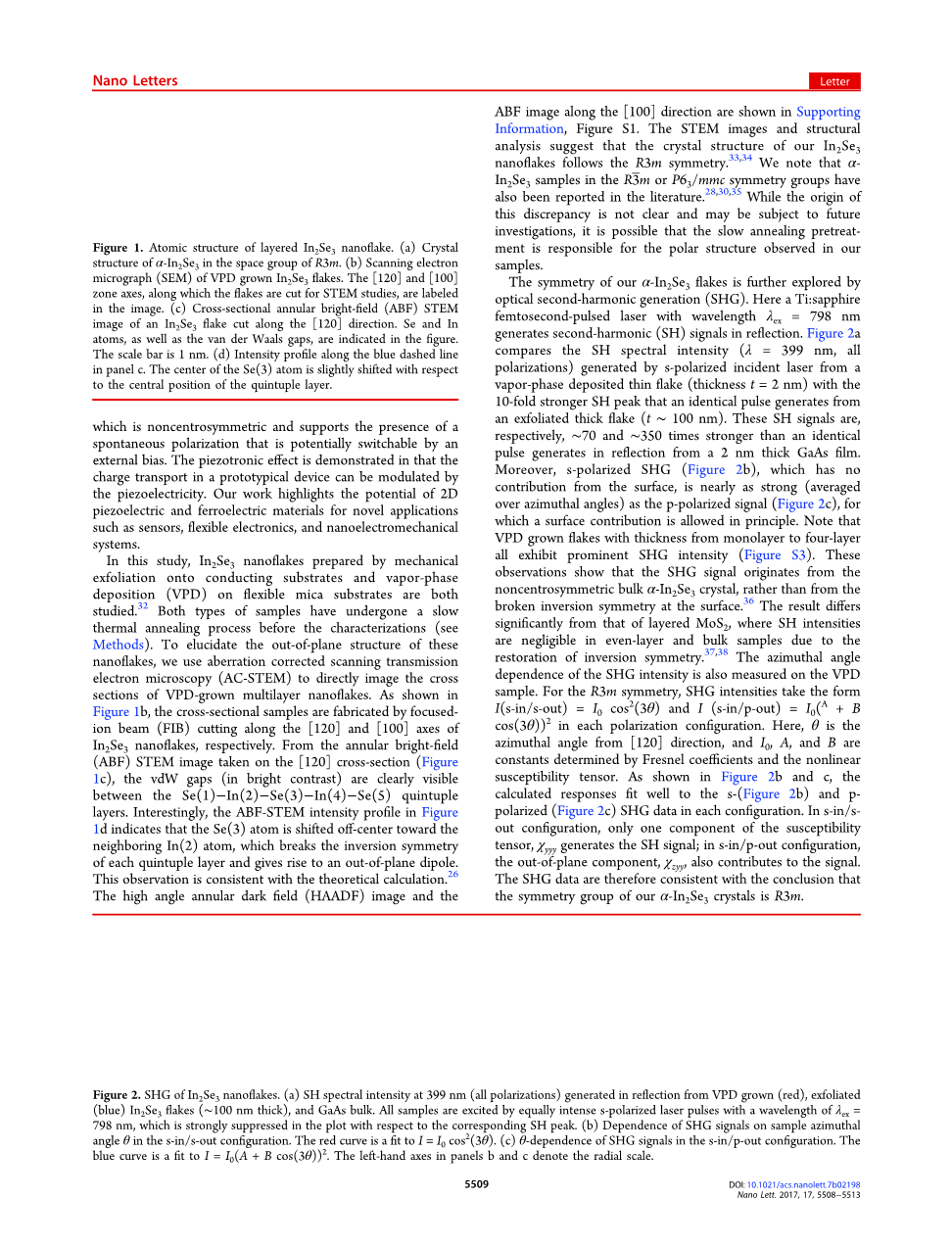 能够维持住二维平面外铁电性是很不容易的,因为缺乏屏蔽电荷的退极化场可能会极大地抑制范德瓦尔斯材料的自发极化。在最近的一份报告中,丁等人预言层状半导体硒化铟(alpha;-In2Se3)是一种室温平面外极化铁电体,能在降至单层极限(厚度~1nm)的情况下维持铁电性,计算出的电偶极子为0.11eAring;/单位晶胞。 In2Se3在相变存储器、热电和光电应用方面有着广泛的应用。但是,由于其多态性和复杂的相图,即使在室温下热力学稳定相的晶体结构(通常表示为alpha;-In2Se3)也仍然存在争议。 本文报告了对于多层alpha;-In2Se3中面外压电性和铁电性的第一次实验观察。 结合使用透射电子显微镜(TEM),二次谐波生成,拉曼光谱和压电力显微镜(PFM),我们发现了In2Se3样品表现出菱形R3m结构(图1a),它是非中心对称的,它的自发极化能够存在,这种自发极化有可能通过外部偏置来切换。 压电效应的证明了原型设备中的电荷运输可以通过压电来调节。 我们的工作着重于二维压电和铁电材料在新型应用(例如传感器,柔性电子和纳米机电系统)中的潜力。