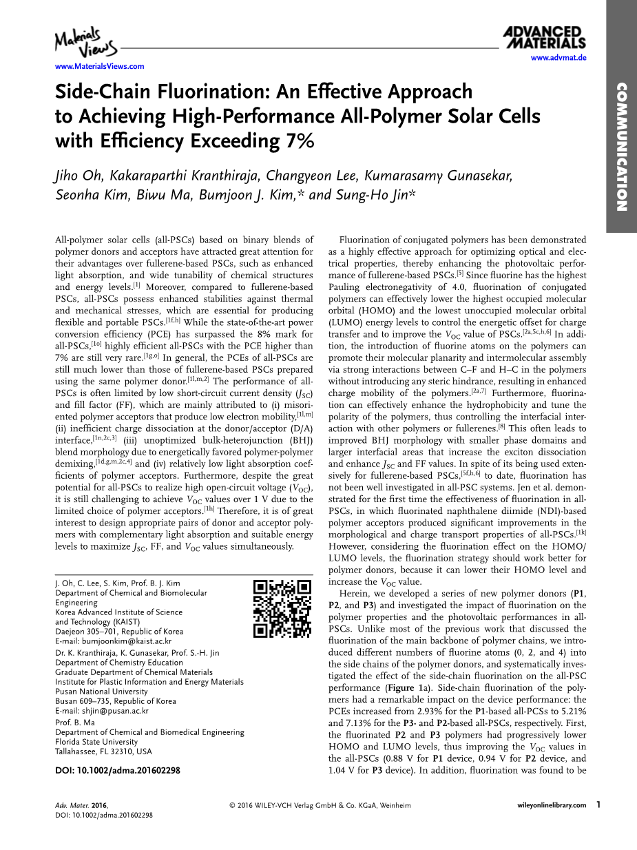 基于聚合物供体和受体的二元共混物的全聚合物太阳能电池(all-PSCs)由于其相对于基于富勒烯的PSC的优势(例如增强的光吸收以及化学结构和能级的广泛可调性)而备受关注。此外,与基于富勒烯的PSC相比,all-PSCs具有增强的抵抗热应力和机械应力的稳定性,这对于生产灵活,便携式的PSC至关重要。最新的电源转换效率(PCE)all-PSCs的百分比均已超过8%,PCE高于7%的高效all-PSCs仍然非常罕见。总的来说,all-PSCs的PCE仍远低于使用相同的聚合物供体制备的基于富勒烯的PSC。all-PSCs的性能通常受到短路电流密度(Jsc)和填充因子(FF)的限制,这主要归因于(i)取向错误产生低电子迁移率的聚合物受体,(ii)供体/受体(D / A)界面处的电荷解离效率低,(iii)由于大力促进了聚合物与聚合物的混合,未优化的本体-异质结(BHJ)共混物形态,和(iv)相对聚合物受体的光吸收系数低。此外,尽管all-PSCs具有实现高开路电压(Voc)的巨大潜力,但由于聚合物受体的选择有限,要实现超过1 V的Voc值仍然具有挑战性。因此,设计具有互补的光吸收和合适的能级以同时最大化Jsc,FF和Voc值的合适的供体和受体聚合物对非常重要。 共轭聚合物的氟化已被证明是优化光学和电学性质的有效方法,从而增强了基于富勒烯的PSC的光伏性能。由于氟的鲍林电负性最高,为4.0,因此共轭聚合物的氟化可有效降低最高占据分子轨道(HOMO)和最低未占据分子轨道(LUMO)能级,以控制电荷转移的能量偏移并提高PSC的Voc值。此外,在聚合物上引入氟原子可以在不引入空间位阻的情况下,通过C-F和H-C在聚合物中的强相互作用促进其分子平面性和分子间组装,从而提高了聚合物的电荷迁移率。此外,氟化可以有效地增强疏水性并调节聚合物的极性,从而控制界面相互作用其他聚合物或富勒烯,这通常会导致BHJ形态得到改善,具有较小的相域和较大的界面面积,从而增加激子解离并提 高Jsc和FF值。迄今为止,尽管其已广泛用于基于富勒烯的PSCs,但在all-PSCs系统中尚未对氟化进行深入研究。仁等。首次证明了氟化在all-PSCs中的有效性,其中基于氟化萘二酰亚胺(NDI)的聚合物受体在all-PSCs的形态和电荷传输性质方面产生了显着改善。然而,考虑到氟化对HOMO / LUMO水平,氟化策略应更好地用于聚合物供体,因为它可以降低其HOMO水平和增加Voc值。