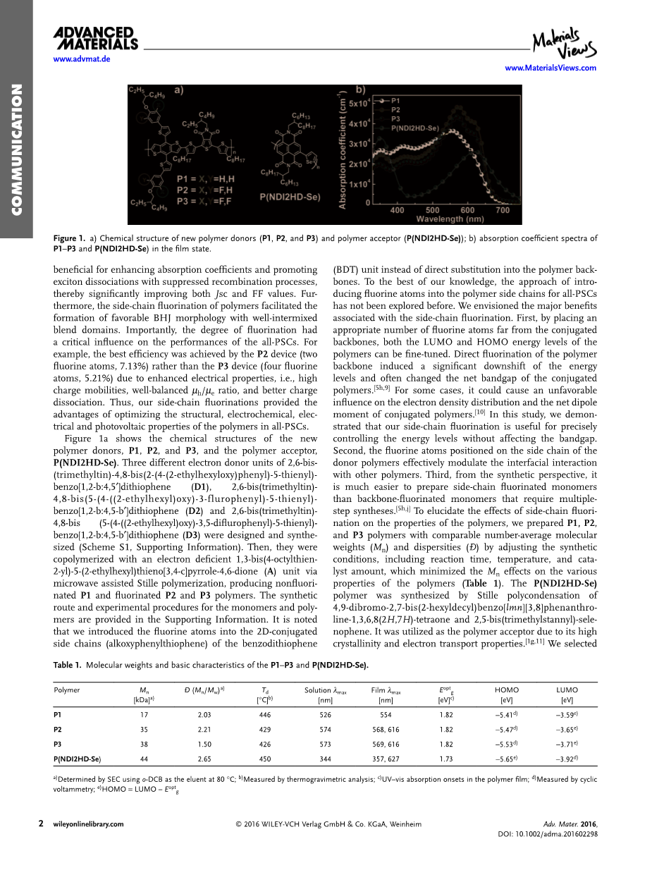 图1a显示了新的聚合物供体P1,P2和P3,以及聚合物受体P(NDI2HD-Se)的化学结构。2,6-双(三甲基锡)-4,8-双(2-(4-(2-(2-乙基己氧基氧基)苯基)-5-噻吩基)-苯并[1,2-b:4,5]的三个不同的电子供体单元 ] dithiophene(D1),2,6-双(三甲基锡)-4,8-(5-(4-(((2-乙基己基)氧基)-3-氟苯基)-5-噻吩基)-苯并[1, 2-b:4,5-b ]二噻吩(D2)和2,6-双(三甲基锡)-4,8-双(5-(4-(((2-乙基己基)氧基)-3,5-二氟苯基)设计并合成了)-5-噻吩基)-苯并[1,2-b:4,5-b ]二噻吩(D3)。然后,将它们与缺电子的1,3-双(4-辛基噻吩-2-基)-5-(2-乙基己基)噻吩并[3,4-c]吡咯-4,6-二酮(A)单元共聚协助Stille聚合,生产非氟化P1以及氟化P2和P3聚合物。支持信息中提供了单体和聚合物的合成路线和实验步骤。注意,我们将氟原子引入了苯并二噻吩的2D共轭侧链(烷氧基苯基噻吩)中(BDT)单元,而不是直接取代到聚合物主链中。据我们所知,以前从未探索过将氟原子引入all-PSCs的聚合物侧链的方法。我们设想了与侧链氟化相关的主要优点。首先,通过将适当数量的氟原子置于远离共轭骨架的位置,可以对聚合物的LUMO和HOMO能级进行微调。聚合物主链的直接氟化作用引起能级的显着下降,并经常改变共轭聚合物的净带隙。在某些情况下,它可能对共轭电子的电子密度分布和净偶极矩产生不利影响聚合物。在这项研究中,我们证明了我们的侧链氟化对于精确控制能级而不影响带隙非常有用。其次,位于供体聚合物侧链上的氟原子有效地调节了与其他聚合物的界面相互作用。第三,从合成的角度来看,制备侧链氟化单体比需要多步合成的骨架氟化单体要容易得多。为了阐明侧链氟化对聚合物性能的影响,我们制备了P1 ,P2和P3聚合物,具有相当的数均分子量(Mn)和分散度(Đ),可通过调节合成条件(包括反应时间,温度和催化剂量)来最大程度地降低Mn对聚合物的影响聚合物的各种特性(表1)。通过4,9-二溴-2,7-双(2-己基癸基)苯并[lmn] [3,8]菲咯啉-1,3,6,8(2H)的Stille缩合反应合成P(NDI2HD-Se)聚合物,7H)-四酮和2,5-双(三甲基锡烷基)-硒烯。由于其高的结晶度和电子传输性能,它被用作聚合物受体。我们为NDI单元选择了2-己基癸基(HD)侧链,以促进具有表面几何形状的晶体堆积。