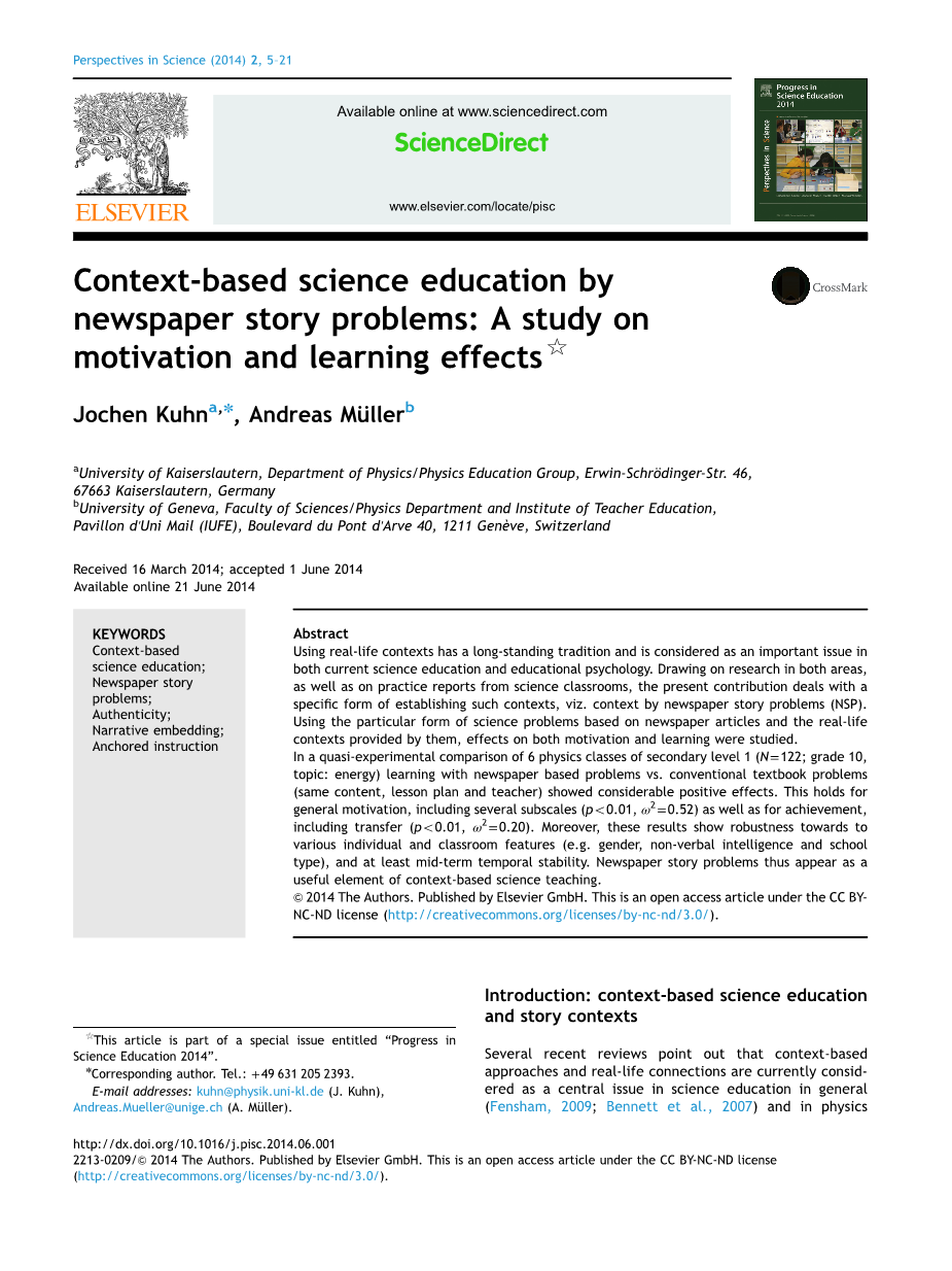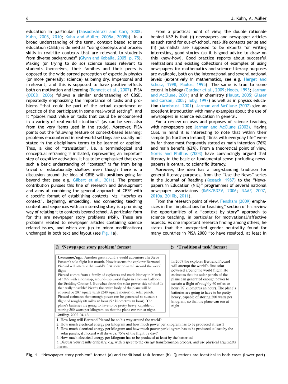 最近几次评论指出,基于情境的方法和现实生活中的联系目前被认为是一般科学教育(Fensham,2009;Bennett等人.,2007),尤其是物理教育的中心议题(Taasoobshirazi and Carr, 2008; Kuhn,2005, 2010; Kuhn and Muller, 2005a, 2005b)。从广义上讲,基于情境的科学教育(CBSE)被定义为在现实生活中使用与来自不同背景的学生相关的概念和过程技能(Glynn and Koballa,2005,p.75)。提出(或试图这样做)与学生自身、家庭和同龄人相关的科学问题,与人们普遍认为的特别是物理学(或更普遍地说:科学)枯燥、客观和无关紧要的看法相反,这应该对动机和学习都有积极影响(Bennett等人,2007)。PISA(OECD经合组织,2006年)遵循对CBSE的类似理解,反复强调任务和问题的重要性,“这些任务和问题可能是参与者在某些现实环境中的实际经验或实践的一部分”,并且“它最重视在各种现实情况下可能遇到的任务”(从研究中使用的项目也可以看出)。此外,PISA还指出了基于情境的学习的以下特点:现实世界中遇到的问题通常不会用要学习或应用的学科术语来陈述。由此引发了一种翻译,即术语和概念的重新建构,代表了认知激活的一个重要步骤。必须强调的是,即使对“语境”的这种基本理解在教育上绝不是微不足道的浅薄,尽管有人围绕CBSE的想法进行了讨论,其立场远不止于此(参见Gilbert等人,2011)。本论文致力于这一领域的研究和开发,旨在将CBSE的一般方法与特定的情境建立形式结合起来,即“将故事作为情境”。用一个有趣的故事开始、嵌入、连接教学内容和序列,是一个很有前途的方式,可以将其与校外的环境联系起来。这样做的一种特殊形式是报纸故事问题(NSP)。这些问题与包含科学相关问题的报纸文章有关,并且在文本和版式上(稍作修改)没有变化(参见图1a)。