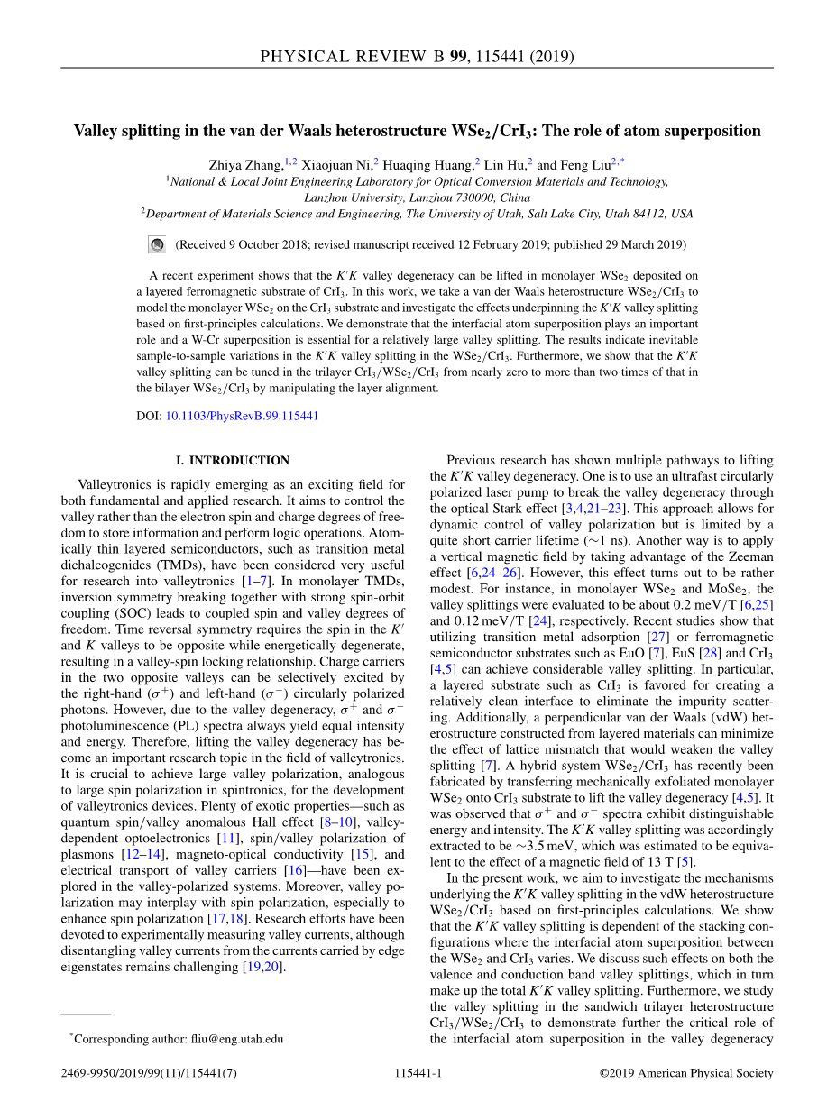 在本工作中,我们旨在研究基于第一性原理计算的VDW异质结构WSe2/CrI3中KK谷分裂的机制。我们发现KK谷 点燃取决于WSe2和CrI3之间的界面原子叠加变化的叠加形状。我们讨论了这种对价和导带谷分裂的影响,这反过来又构成了总的谷分裂。此外,我们还研究了三明治三层异质结构CrI3/WSe2/CrI3中的谷分裂,以进一步证明界面原子叠加在谷减速上涨中的关键作用。本文的其余部分安排如下。在证券交易委员会。我们描述了所使用的方法。结果和讨论在证券交易委员会提出。我们在证券交易委员会结束我们的工作。