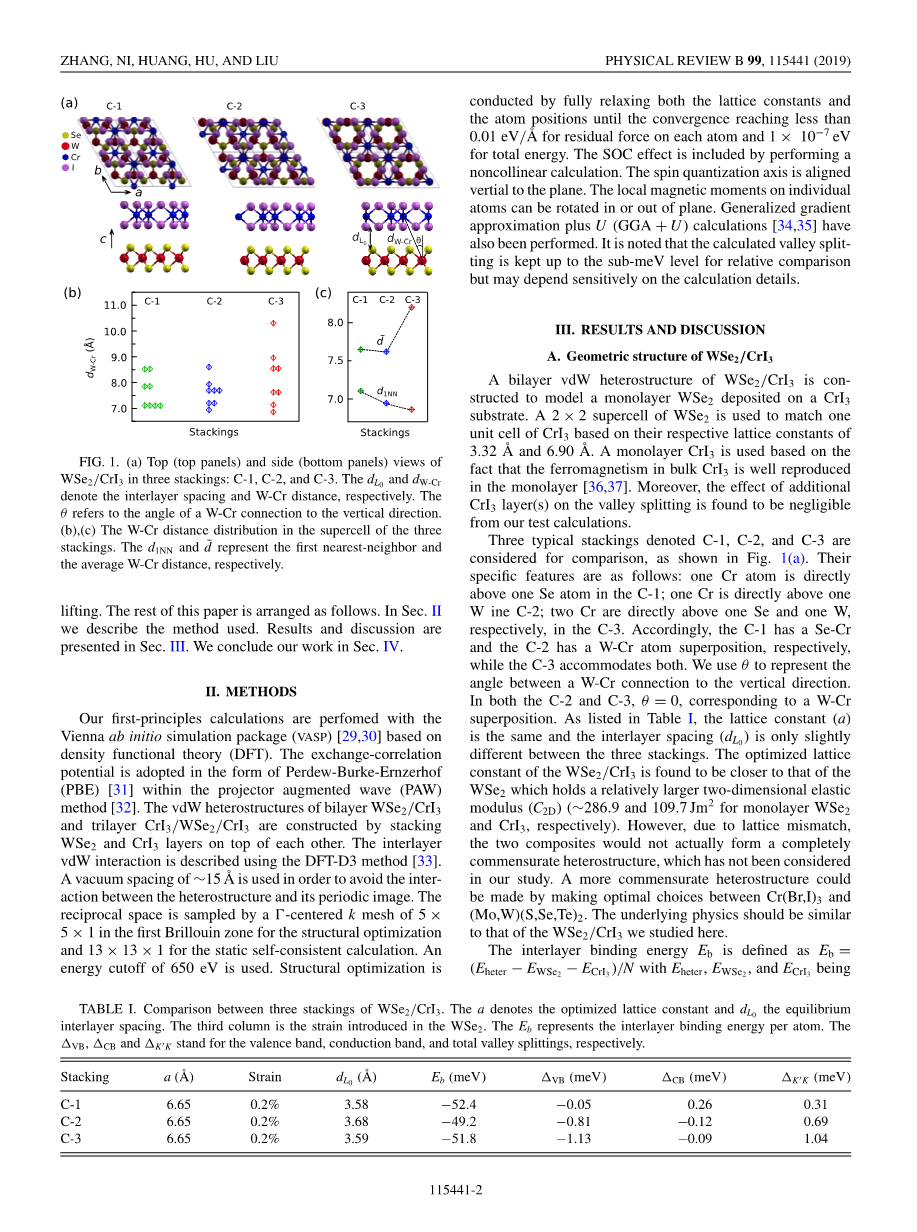 三个典型的堆叠表示C-1,C-2和C-3被考虑进行比较,如图1(a)。它们的具体特征如下:一个Cr原子直接高于C-1;o中的一个Se原子 在C-3中,NeCr直接高于一个WineC-2;两个Cr分别直接高于一个Se和一个W。因此,C-1有一个Se-Cr,C-2分别有一个W-Cr原子叠加,而C-3则容纳两者。我们用theta;来表示W-Cr连接到垂直方向之间的角度..在C-2和C-3中,theta;=0,对应于W-Cr叠加。如表一所示,晶格常数(A)相同,层间距(D L0)在三个堆叠之间仅略有不同。WSe2/CrI3的优化晶格常数为 发现更接近WSe2,其具有相对较大的二维弹性模量(C2D)(单层WSe2和CrI3分别为-286.9和109.7Jm2)。然而,由于晶格失配,这两种复合材料实际上不会形成完全相称的异质结构,这在我们的研究中还没有得到考虑。 通过在Cr(Br,I)3和(Mo,W)(S,Se,Te)2之间做出最佳选择,可以获得更合适的异质结构。潜在的物理应该类似于我们在这里研究的WSe2/CrI3。