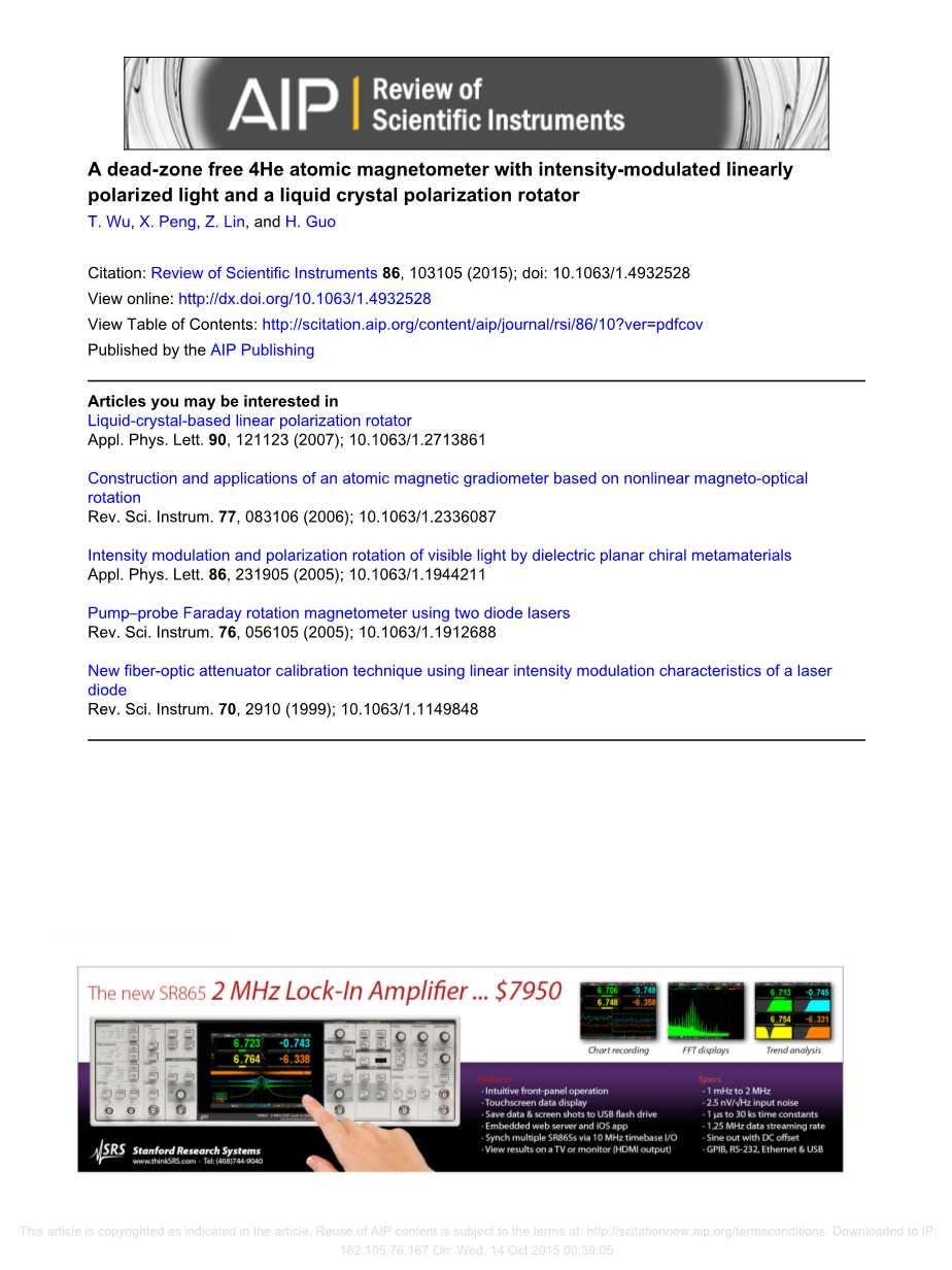 具有调强线偏振光和液晶偏振旋转器的无死区4He原子磁强计