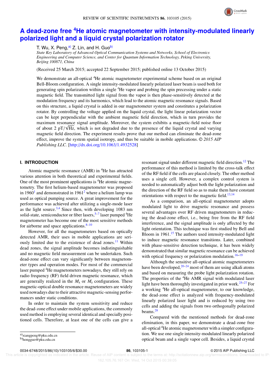 虽然已经研制出了灵敏的全光原子磁强计,但大多数都是基于碱原子和测量探测光的偏振旋转。4He-AMR调制激光信号的特性已经有了深入的研究。据我们所知,工作中的4He全光磁强计,利用调频线偏振激光对死区效应进行分析,并用两个单元和两个正交偏振光的信号相加来减小死区效应。