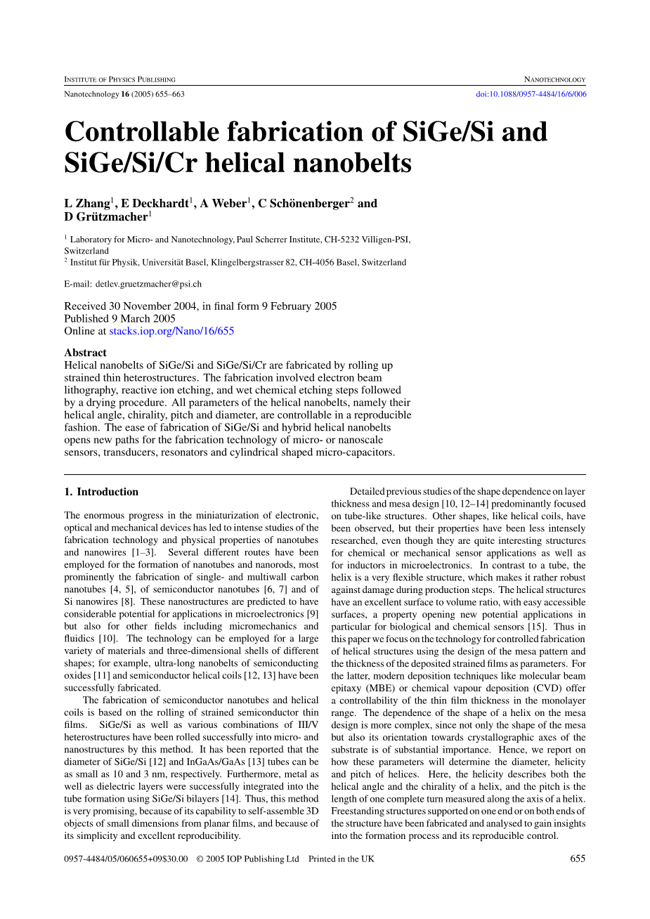 SiGe/Si和SiGe/Si/Cr的螺旋纳米带是通过轧制应变薄异质结构来制备的。制造涉及电子束光刻,反应离子蚀刻,湿化学蚀刻步骤,然后干燥过程。螺旋形纳米带的所有参数,即它们的螺旋角、手性、节距和直径,以可重复的方式可控。SiGe/Si和杂化螺旋纳米带的制备容易为微纳米传感器、传感器、谐振器和圆柱形微电容器的制造技术开辟了新的途径。