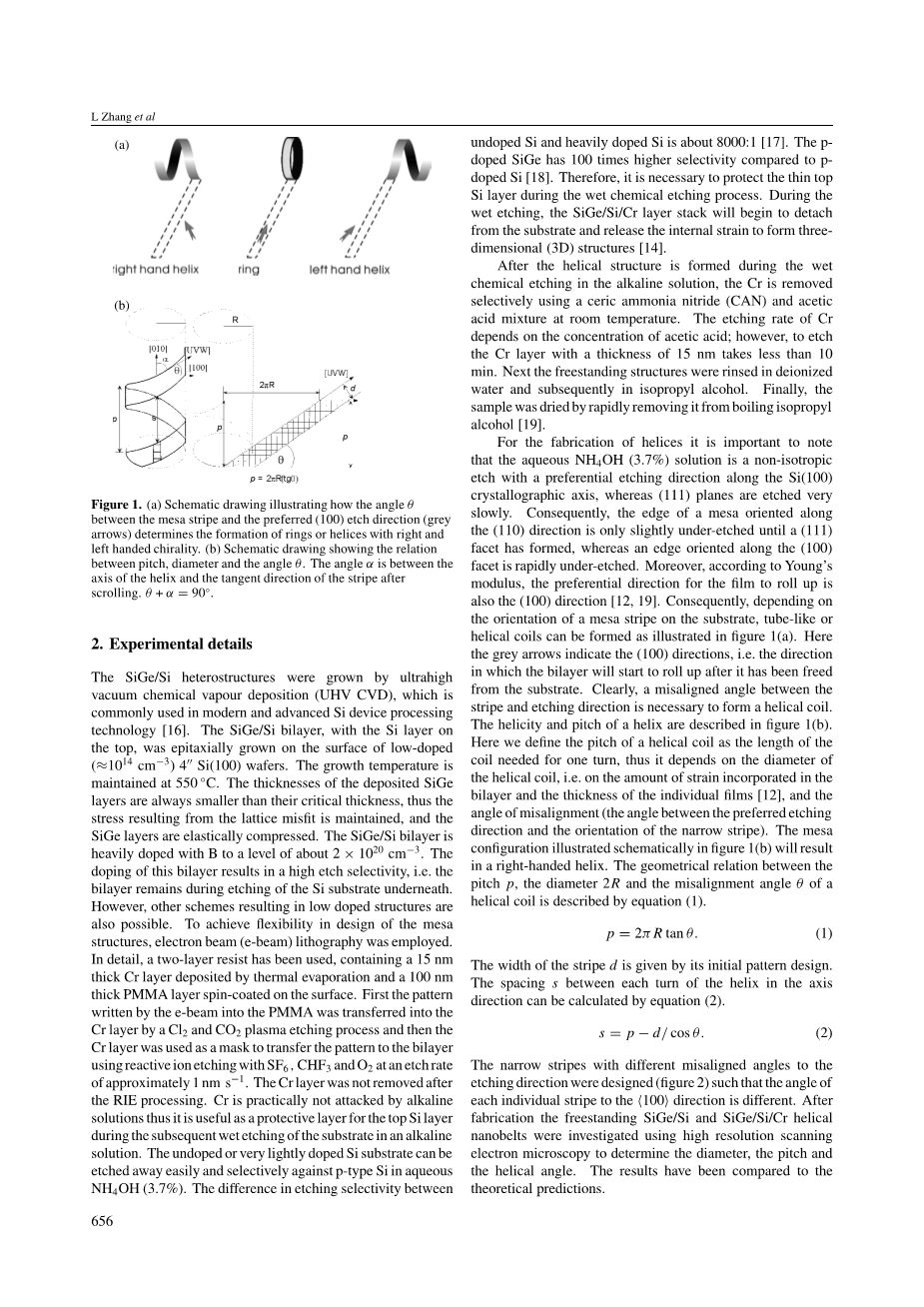 对于螺旋的制备,重要的是要注意的是,水性NH4OH(3.7%)溶液是沿Si(100)晶轴择优蚀刻方向的非各向同性蚀刻,而(111)面刻蚀得非常慢。因此,沿(110)方向取向的台面的边缘仅轻微蚀刻直到形成(111)刻面,而沿(100)面取向的边缘被迅速蚀刻。此外,根据杨氏模量,薄膜卷起的优先方向也是(100)方向[12, 19 ]。因此,取决于衬底上的台面条纹的方向,可以形成如图1(a)所示的管形或螺旋线圈。在这里,灰色箭头指示了(100)方向,即双层被从基板释放后开始卷起的方向。显然,为了形成螺旋线圈,条纹和蚀刻方向之间的错位角是必要的。螺旋线的螺旋度和螺距如图1(b)所示。这里,我们将螺旋线圈的间距定义为一匝所需线圈的长度,因此它取决于螺旋线圈的直径,即在双层中包含的应变量和单个膜的厚度(12),以及未对准的角度(优选蚀刻方向与取向之间的夹角)。窄条纹的)图1(b)中示意性地示出的台面结构将导致右手螺旋。用方程(1)描述了螺旋线圈的螺距P、直径2R和不对准角Th的几何关系。