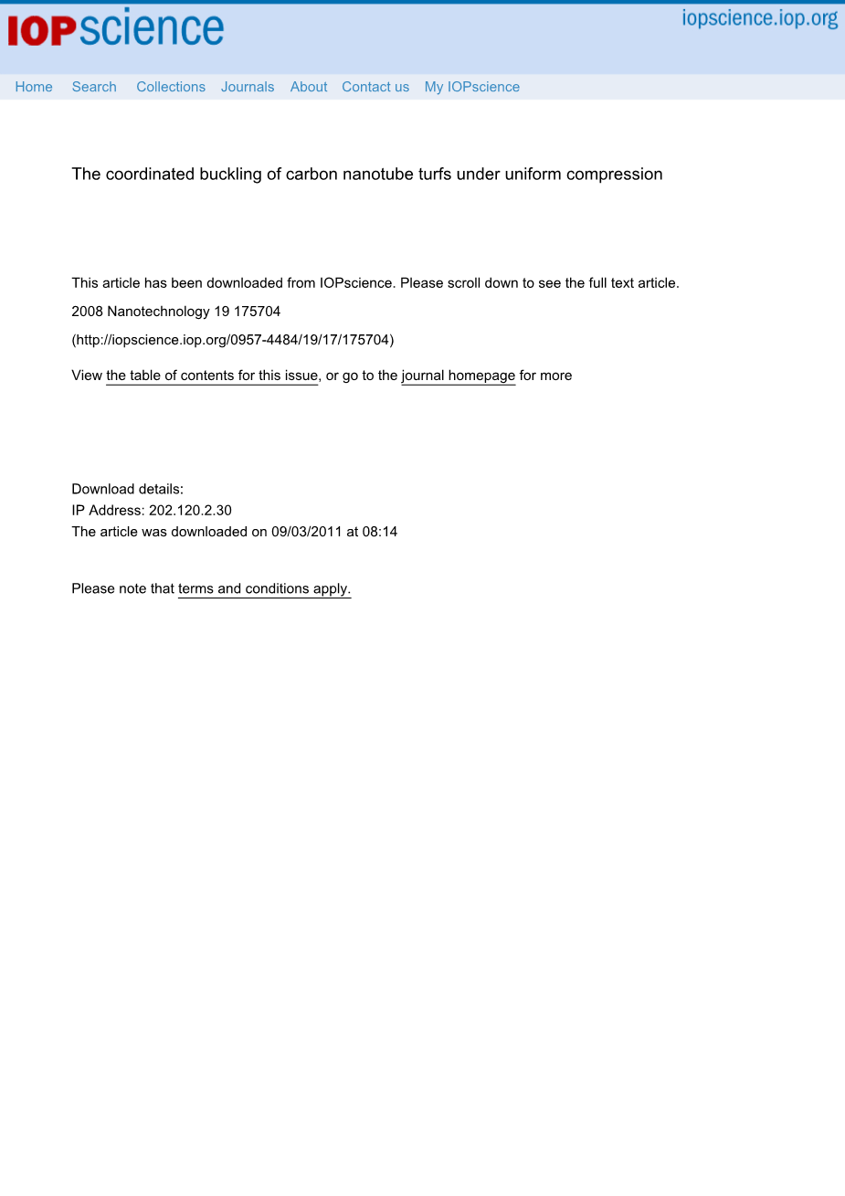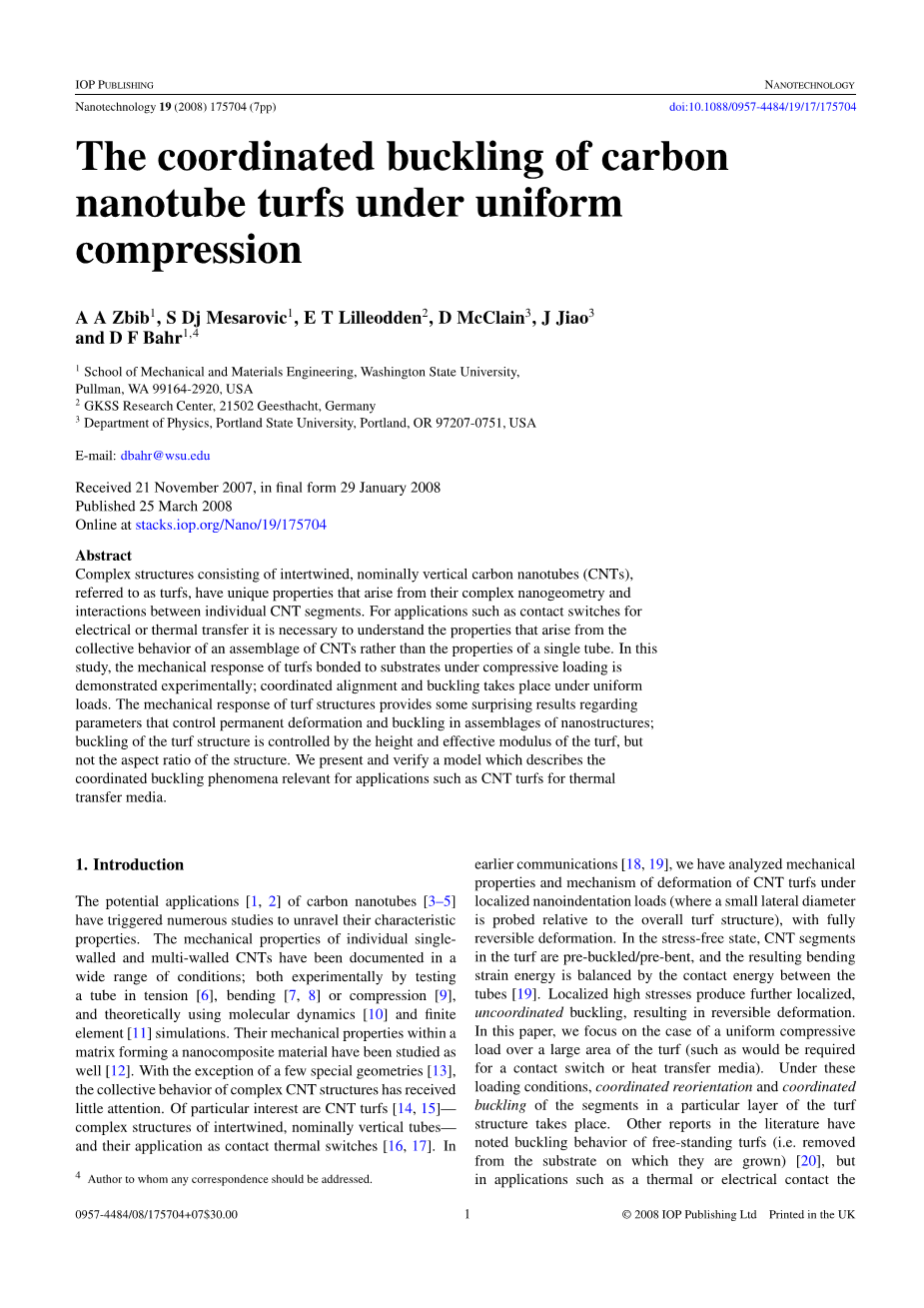 碳纳米管的潜在应用[1,2][3-5]引发了大量的研究,揭示了它们的特性。单壁碳纳米管和多壁碳纳米管的力学性能已经在各种条件下得到了证实;这两种条件都是通过实验测试得到的。在拉伸,弯曲[7,8]或压缩[9],理论上使用分子动力学[10]和有限元模拟。它们在形成纳米复合材料的基体中的力学性能也已经研究过。除了一些特殊的几何形状外,复杂CNT结构的集体行为几乎没有受到关注。特别令人感兴趣的是碳纳米管(CNT turfs)[14,15]--名义上为垂直管的复杂结构--以及它们作为接触式热开关的应用[16,17]。在前期的文献[18,19]中,我们分析了碳纳米管草皮在局部纳米压痕载荷作用下的力学性能和变形机理(相对于草皮的整体结构而言,草皮的侧向直径较小),并且具有完全可逆的变形。在无应力状态下,草坪中的碳纳米管节段被预扣/预弯曲,由此产生的弯曲应变能被管之间的接触能平衡[19]。局部高应力产生进一步局部化,不协调屈曲,导致可逆变形。在本文中,我们集中在一个均匀的压缩负荷的情况下,在大面积的草皮(如将需要一个接触开关或热传递介质)。在这些荷载条件下,草皮结构的某一特定层段的协调重新定位和协调屈曲发生。文献中的其他报告已经注意到独立的草皮的屈曲行为(即从它们生长的基质上移除)[20],但是在诸如热或电接触的应用中必须考虑粘结在半导体基板上的胶泥的性能。为此,我们(1)提出了测量相关力学性能和阐明协调屈曲行为的实验结果,(2)发展了一个简单的协调屈曲模型的基础上,CNT节段的集体力学,并与实验结果进行了比较。