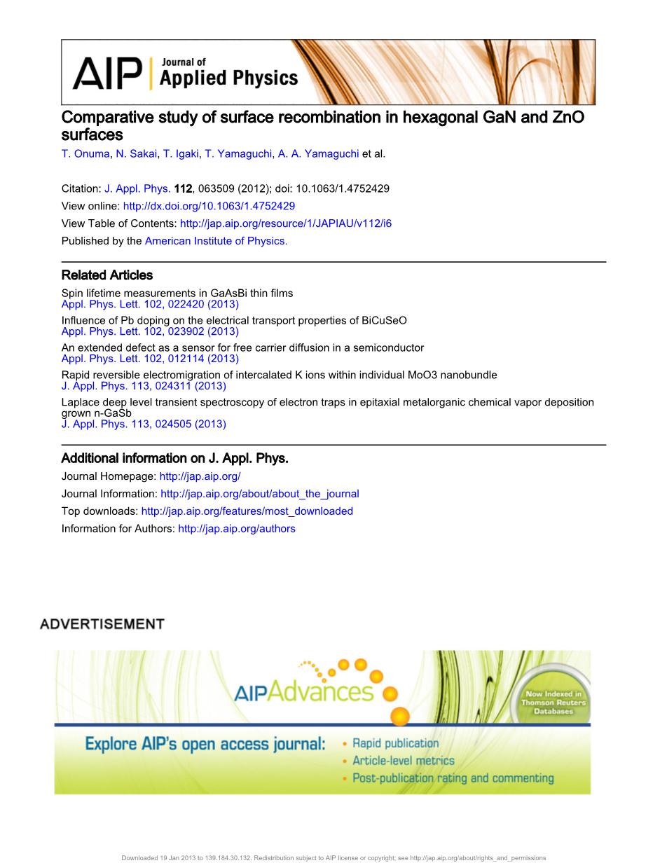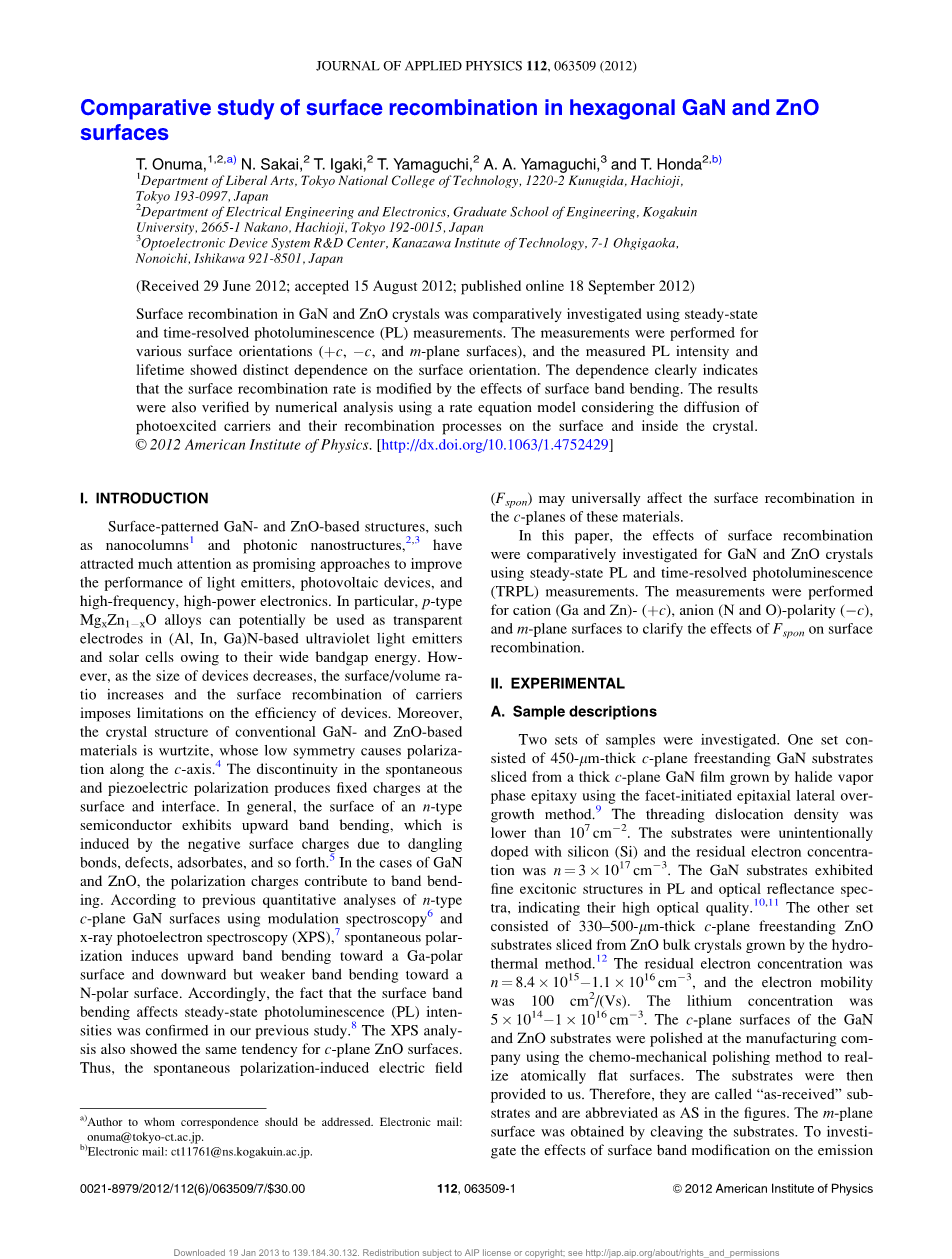 用稳态和时间分辨光致发光(PL)测量方法对GaN和ZnO晶体中的表面复合进行了比较研究。对不同的表面取向( c、-c和m平面表面)进行了测量,测量的PL强度和寿命对表面取向有明显的依赖性。这一依赖关系清楚地表明,表面复合速率是由表面带弯曲的影响而改变的。利用考虑光激发载流子扩散及其在晶体表面和内部的复合过程的速率方程模型对结果进行了数值分析。2012美国物理研究所。