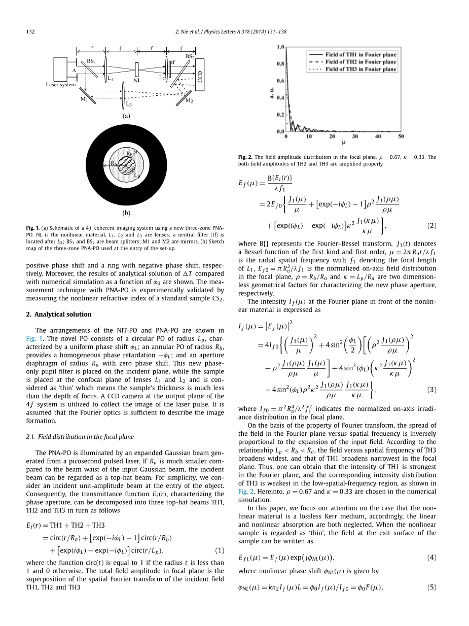 NIT-PO和PNA-PO的安排如图1所示,新PO由半径为的圆PO组成,其特征是均匀的相移;半径Rb的环形PO提供均匀相延迟minus;;和半径为的零相移的孔径膜。这种新的仅相位光瞳滤波器放置在入射平面上,而样品放置在透镜L1和L2的共焦平面上,被认为是“薄”,这意味着样品的厚度远小于聚焦深度。利用在4f系统的输出平面上的CCD照相机来收集激光脉冲的图像。这时在假设傅里叶光学足以描述图像的形成的条件下。