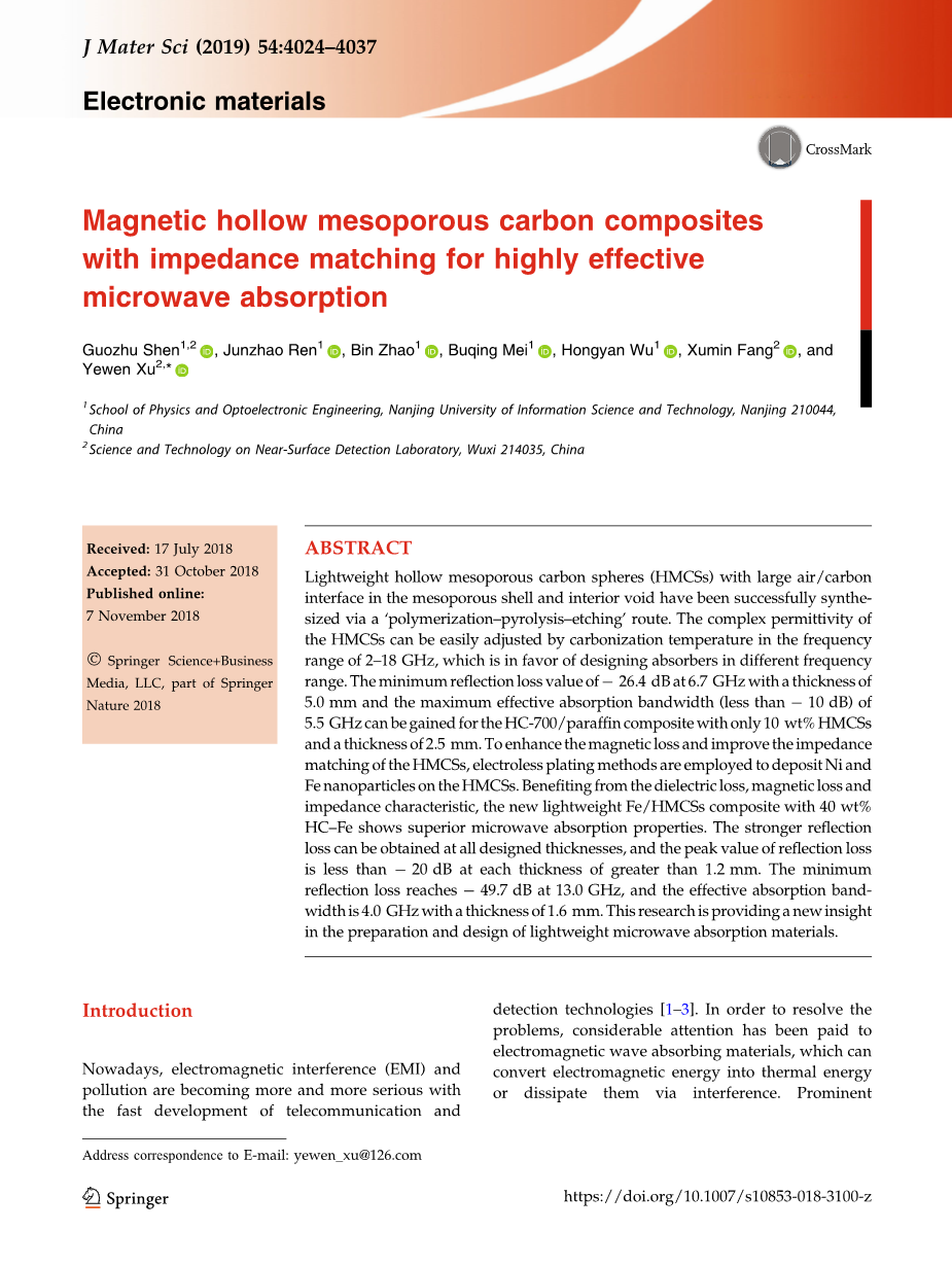 具有阻抗匹配的磁性中空介孔碳复合材料具有高效的微波吸收性能