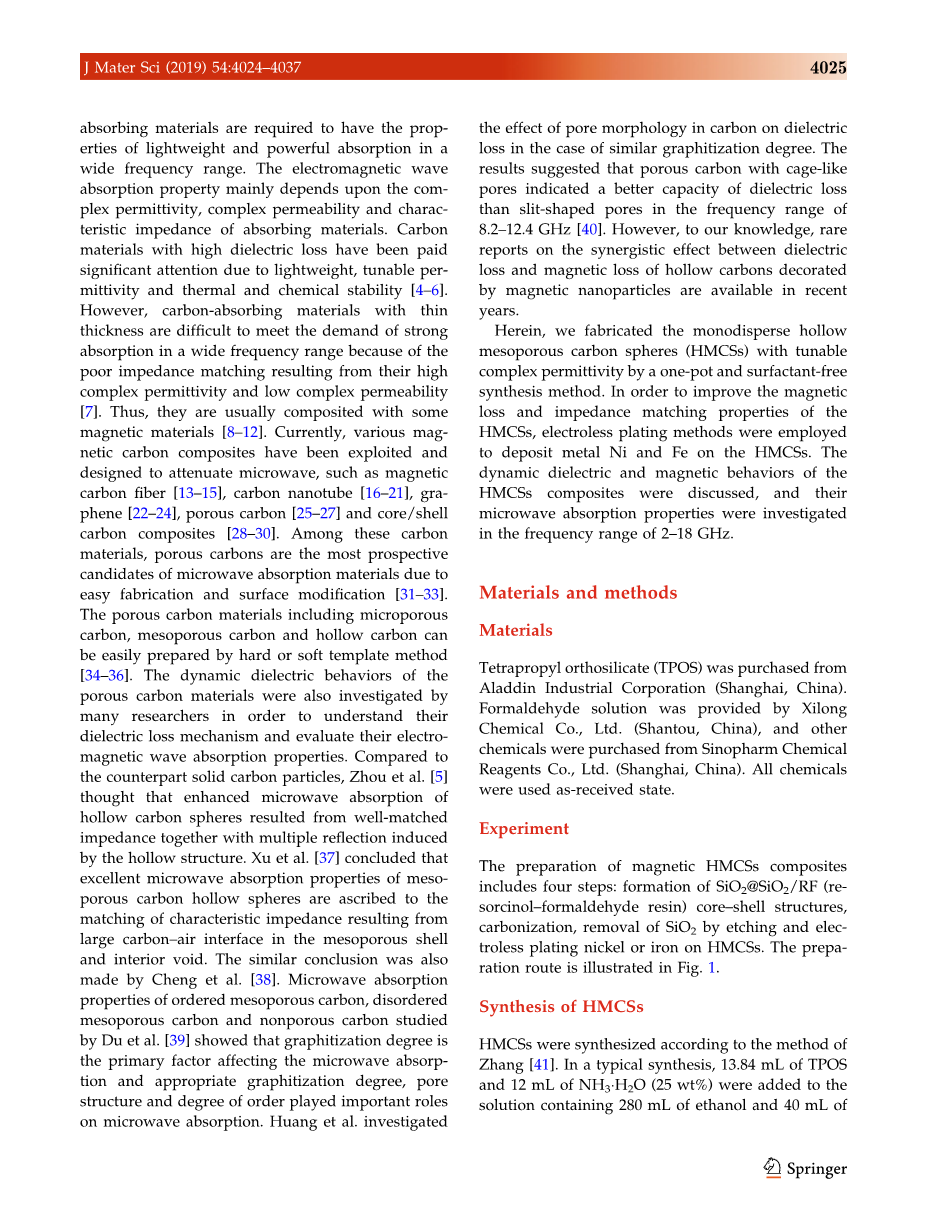 如今,随着通信和检测技术的快速发展,电磁干扰(EMI)和污染问题越来越严重[1-3]。为了解决这一问题,人们对电磁波吸收材料给予了相当的重视。电磁波吸收材料可以将电磁波能量转化为热能,也可以通过干扰将其耗散。在较宽的频率范围内,要求吸波材料具有重量轻、吸波能力强的特点。电磁波的吸收性能主要取决于吸波材料的复介电常数、复磁导率和特性阻抗。高介电损耗的碳材料因其轻质、可调谐的介电常数和热化学稳定性而受到人们的重视[4-6]。然而,由于复合介电常数高、复合磁导率低,导致阻抗匹配较差,薄厚度吸碳材料难以满足宽频段强吸收的要求。因此,它们通常由一些磁性材料组成[8-12]。目前,各种磁性碳复合材料已被开发和设计用于微波衰减,如磁性碳纤维[13-15]、碳纳米管[16-21]、石墨烯[22-24]、多孔碳[25-27]和芯/壳碳复合材料[28-30]。在这些碳材料中,多孔碳材料由于制备简单、表面改性容易,是最有前途的微波吸收材料[31-33]。微孔炭、介孔炭、中空炭等多孔炭材料可采用硬模板法或软模板法制备[34-36]。为了了解多孔碳材料的介电损耗机理,评价其电磁波吸收特性,许多研究人员还对多孔碳材料的动态介电行为进行了研究。与固体碳颗粒相比,Zhou等人[5]认为空心碳球的微波吸收增强是由于阻抗匹配良好以及空心结构引起的多次反射。Xu等人认为,介孔炭空心球优异的微波吸收性能是由于介孔壳内大的碳-空气界面与内部孔隙特征阻抗匹配所致。Cheng等人也得出了类似的结论。Du等人研究了有序介孔碳、无序介孔碳和无孔碳的微波吸收特性。[39]表明石墨化程度是影响微波吸收的主要因素,适当的石墨化程度、孔结构和有序程度对微波吸收起着重要作用。Huang等人研究了在石墨化程度相近的情况下,碳的孔隙形态对介电损耗的影响。结果表明,在8.2 ~ 12.4 GHz[40]频率范围内,笼状孔隙的多孔炭比裂隙状孔隙具有更好的介电损耗能力。然而,据我们所知,近年来关于磁性纳米粒子修饰的空心碳的介电损耗与磁损耗之间的协同效应的报道并不多见。