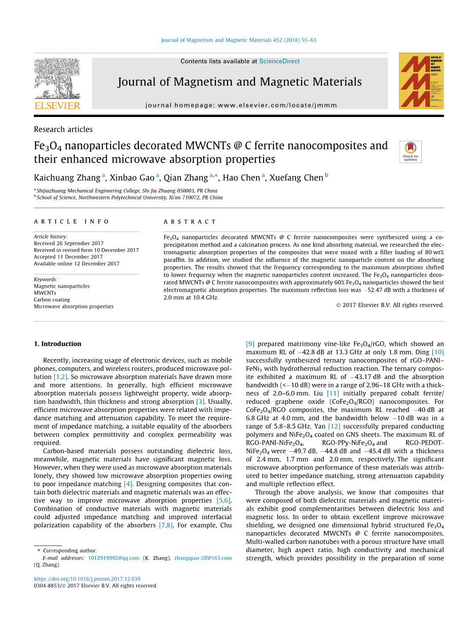 Fe3O4纳米粒子修饰碳纳米管@ C铁氧体纳米复合材料及其增强的微波吸收性能