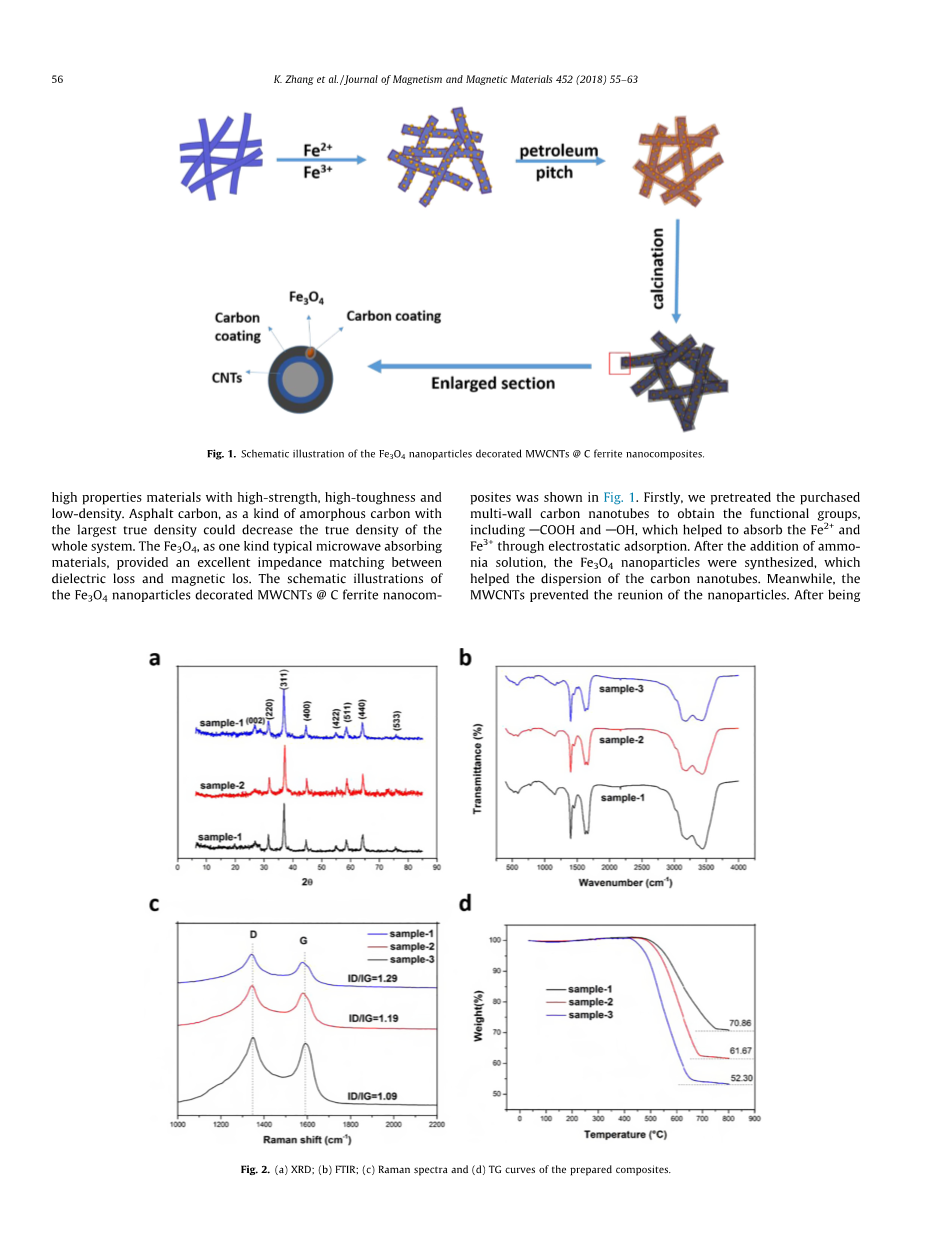 通过以上分析,我们知道由介电材料和磁性材料组成的复合材料在介电损耗和磁损耗之间表现出良好的互补性。为了获得优异的改进微波屏蔽,我们设计了一维杂化结构的Fe3O4纳米粒子修饰的多壁碳纳米管@ C铁氧体纳米复合材料。具有多孔结构的多壁碳纳米管具有小直径、高纵横比、高导电性和机械强度,这为制备一些高强度、高韧性和低密度的高性能材料提供了可能。沥青碳作为一种最大真密度的无定形碳,会降低整个系统的真密度。Fe3O4作为一种典型的微波吸收材料,在介电损耗和磁损耗之间提供了极好的阻抗匹配。Fe3O4纳米颗粒修饰的多壁碳纳米管 @ C铁氧体纳米复合材料的示意图如图1所示。首先,我们对购买的多壁碳纳米管进行预处理,以获得官能团,包括 -COOH和 -OH,这有助于通过静电吸附吸收Fe2 和Fe3 。加入氨水后,合成了Fe3O4纳米粒子,这有助于碳纳米管的分散。同时,多壁碳纳米管阻止了纳米颗粒的团聚。涂覆石油沥青后,产品在高温下煅烧。在高温煅烧过程中,石油沥青被碳化形成碳涂层。此外,处理过的碳纳米管的官能团被去除。得到的产物是Fe3O4纳米粒子修饰的碳纳米管@ C铁氧体纳米复合材料,其中沥青碳涂层和碳纳米管提供了介电损耗,Fe3O4纳米粒子提供了磁损耗,这形成了良好的阻抗匹配以增强微波吸收性能。