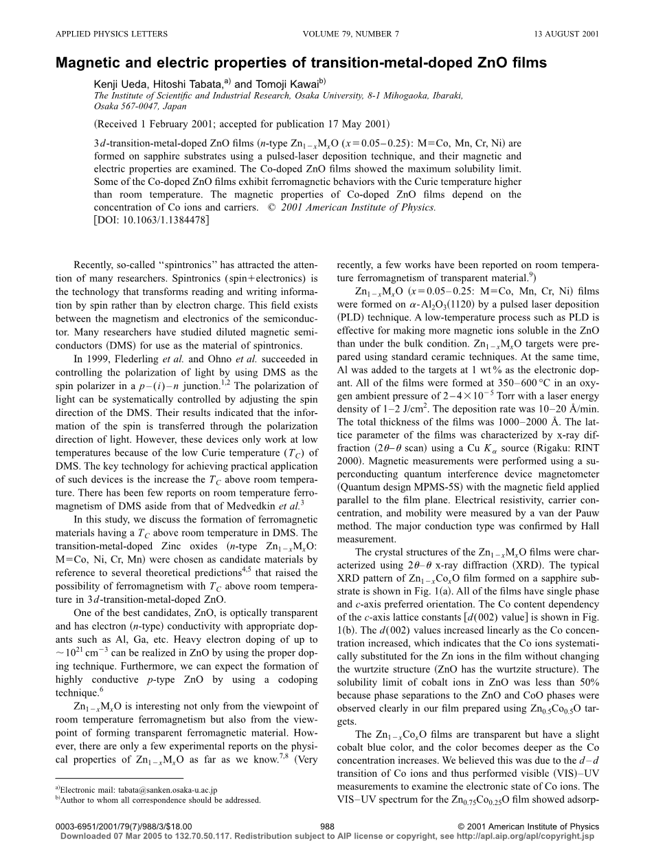 3维的掺杂过渡金属ZnO薄膜(N型Zn1-xMxO (x=0.05– 0.25): M=Co,Mn,Cr,Ni)是用脉冲激光沉积技术形成于蓝宝石感光底层上,我们测量了这些样品的电学和磁学性质。掺杂Co的ZnO薄膜展现出最大限度的溶解度。一些掺杂Co的ZnO薄膜下展示出具有比室温更高的居里温度的电磁特性。掺杂Co的ZnO薄膜的磁性取决于Co的离子和载流子浓度。copy; 2001年美国物理协会