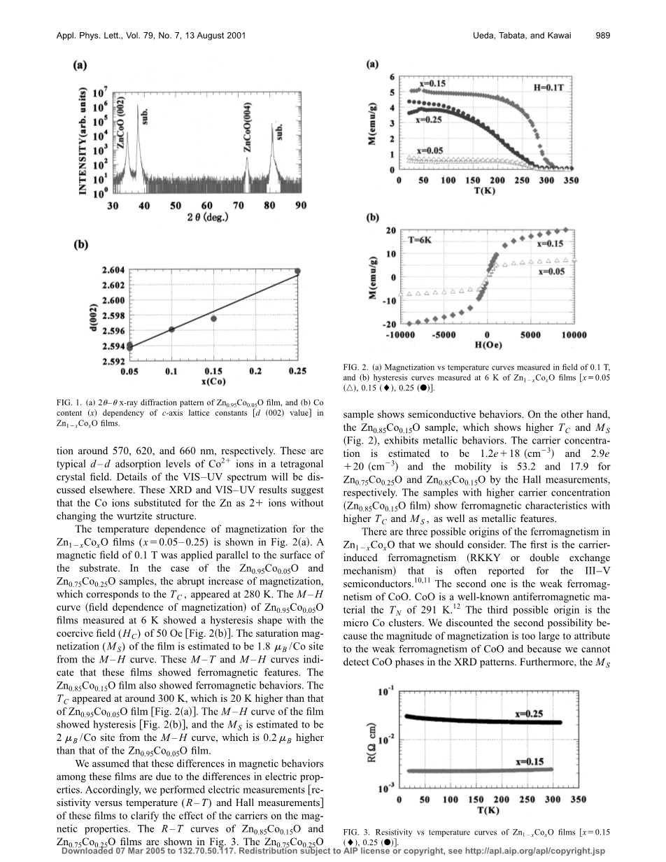 我们考虑到Zn1-xCoxO具有铁磁性有三种可能的来源。第一种可能性是载流子是经常被作为III–V族半导体报道的铁磁性粒子(RKKY或者双交换机制)10,11。第二种可能性是CoO的弱铁磁性。正如我们所知,CoO是Tn(聂耳温度)为291K反铁磁性材料。第三种可能是极小的Co形成团簇。我们对第二种可能这里不做考虑,因为对CoO这种弱磁性物质来说,这么大的磁化强度不可能由其弱磁性产生,而且我们在XRD衍射图中没有发现CoO相。此外,我们样品的Ms大概在2 micro;B/Co,但是如图3