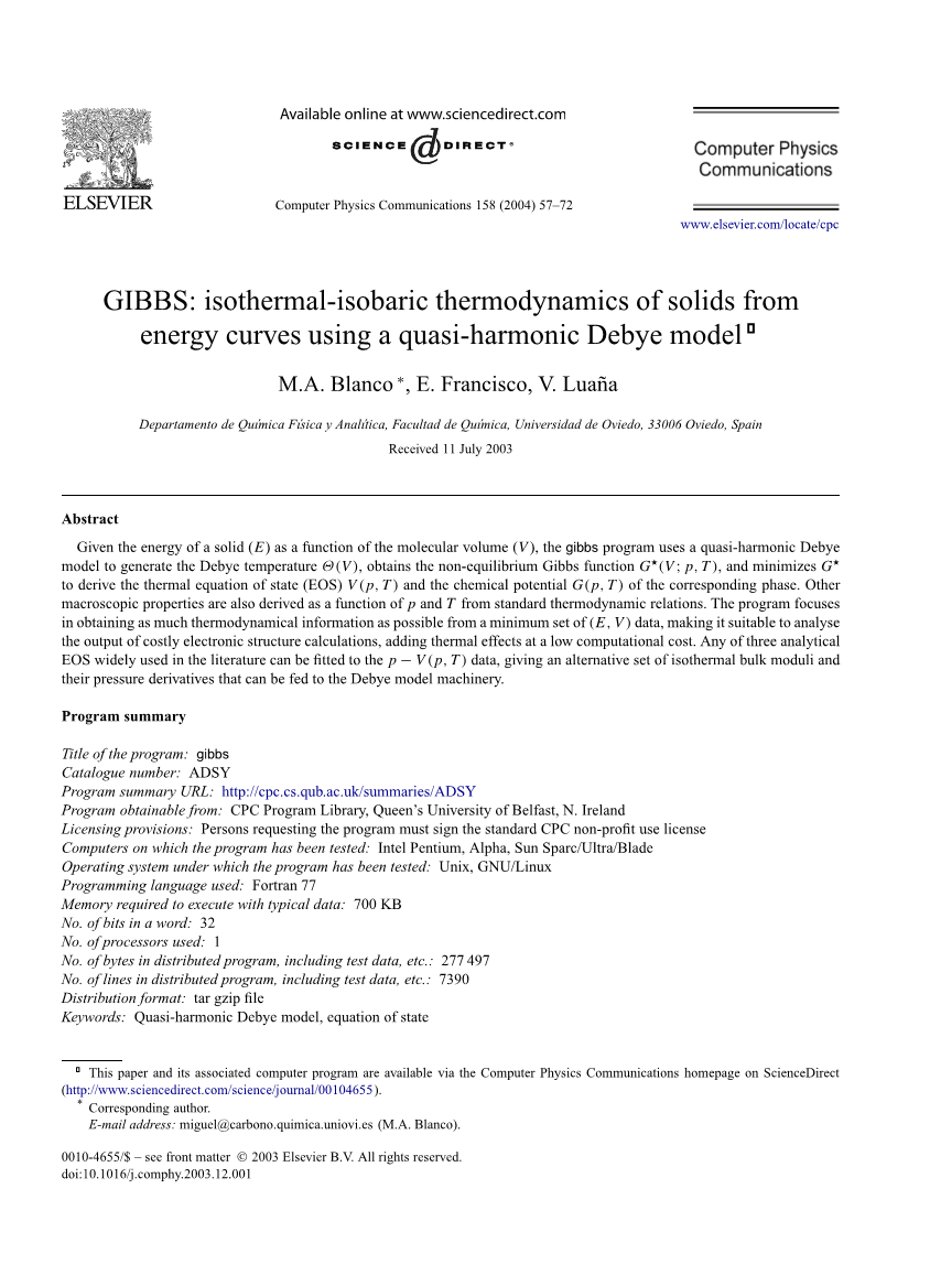 给定固体的能量(E)作为分子体积的函数(V),吉布斯程序使用一个准谐波德拜模型生成德拜温度Theta;(V),得到非平衡吉布斯函数G(V;p,T),并最小化G推导了相应相的热态方程V(p,T)和化学势G(p,T)。其他宏观性质也是由标准热力学关系导出的p和T的函数。该程序的重点是从一组最小的(E,V)数据中获取尽可能多的热力学信息,使之适合分析复杂的电子结构计算的输出,以较低的计算成本增加热效应。文献中广泛使用的三种分析方程中的任何一种都可以与pminus;V(p,T)数据进行拟合,给出一组可供选择的等温体积模量和他们的压力导数,可以给德拜模型机器。