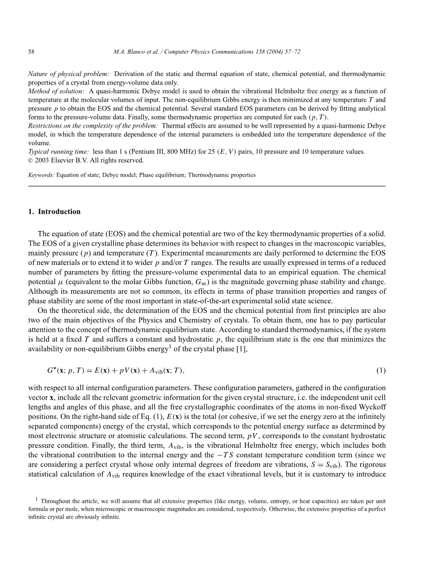 让我们假设一个适当的(从头算[8-12]或其他)近似算法计算E(X)是可用的。然后,在适当应用拟调和德拜模型之前,必须将这个多变量曲面转换成E(V)曲线。这可以通过两种同等的方式来完成。一方面,由于体积通常是格参数的一个相当简单的函数,例如,对于一组固定的体积,可以最小化E(X), 优化内部坐标、角度和胞长比(c/a和b/a);写V=abcf(alpha;,beta;,gamma;)/Z=a3g(alpha;,beta;,gamma;,b/a,c/a),其中Z是单位细胞的分子数,f和g根据晶体系统和相的布拉韦晶格,对每个体积定义为a=[V/g(alpha;,beta;,gamma;,b/a,c/a)]1/3。这产生了一条曲线E(V)=E(xopt(V)),其中包含在不同的常数V超平面上具有最低能量的表面点。另一方面,可以在几个恒定压力下进行静态优化,使用Gstatic(x; p) = Hstatic (x; p) = E(x) pV (x) 函数获得xopt(p)。正如我们在导言中所显示的,这将导致静态EOS V(P)=V(xopt(P)),以及从而得到E(P)=E(xopt(P))。由于EOS将是(V,p)值的表,我们可以将其反转以获得(E,V)成对,得到我们想要的。