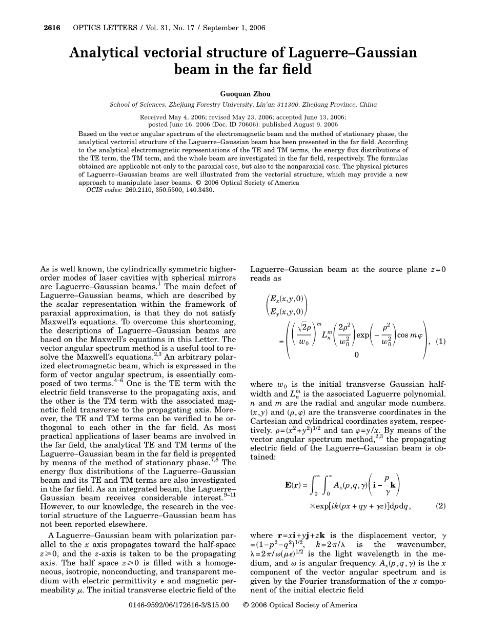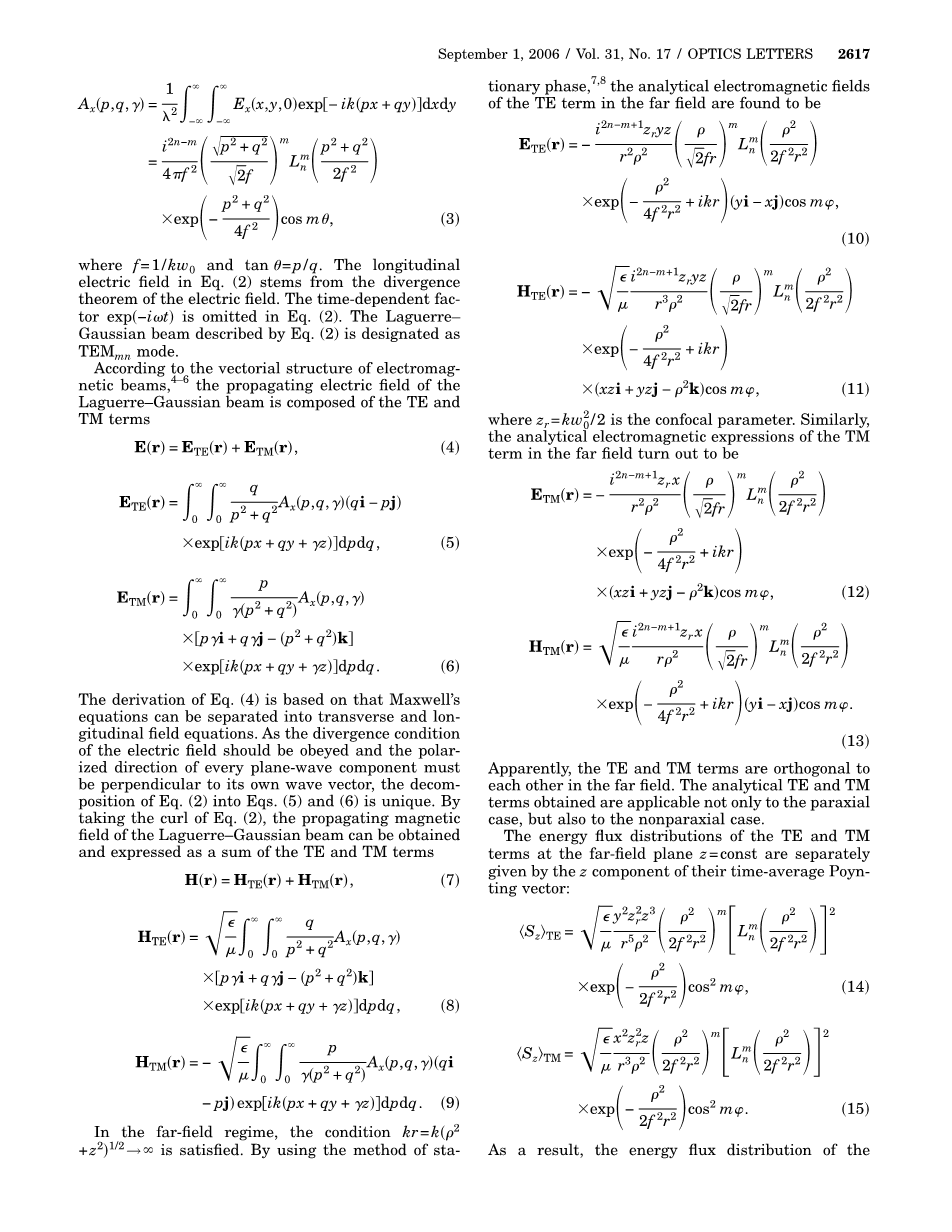 f = 1 / k和=p/q的纵向电场在式(2)从电场散度定理的茎。时间因素exp(-iomega;t)是略在式(2)。拉盖尔高斯光束描述公式(2)被指定为TEMmn模式。
