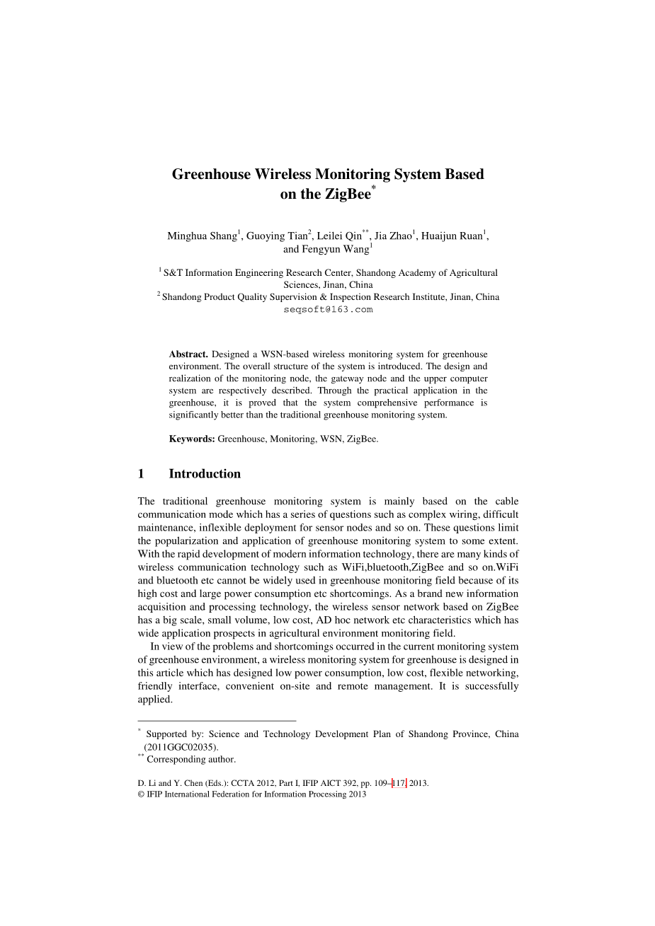 Greenhouse Wireless Monitoring System Based on the ZigBee*