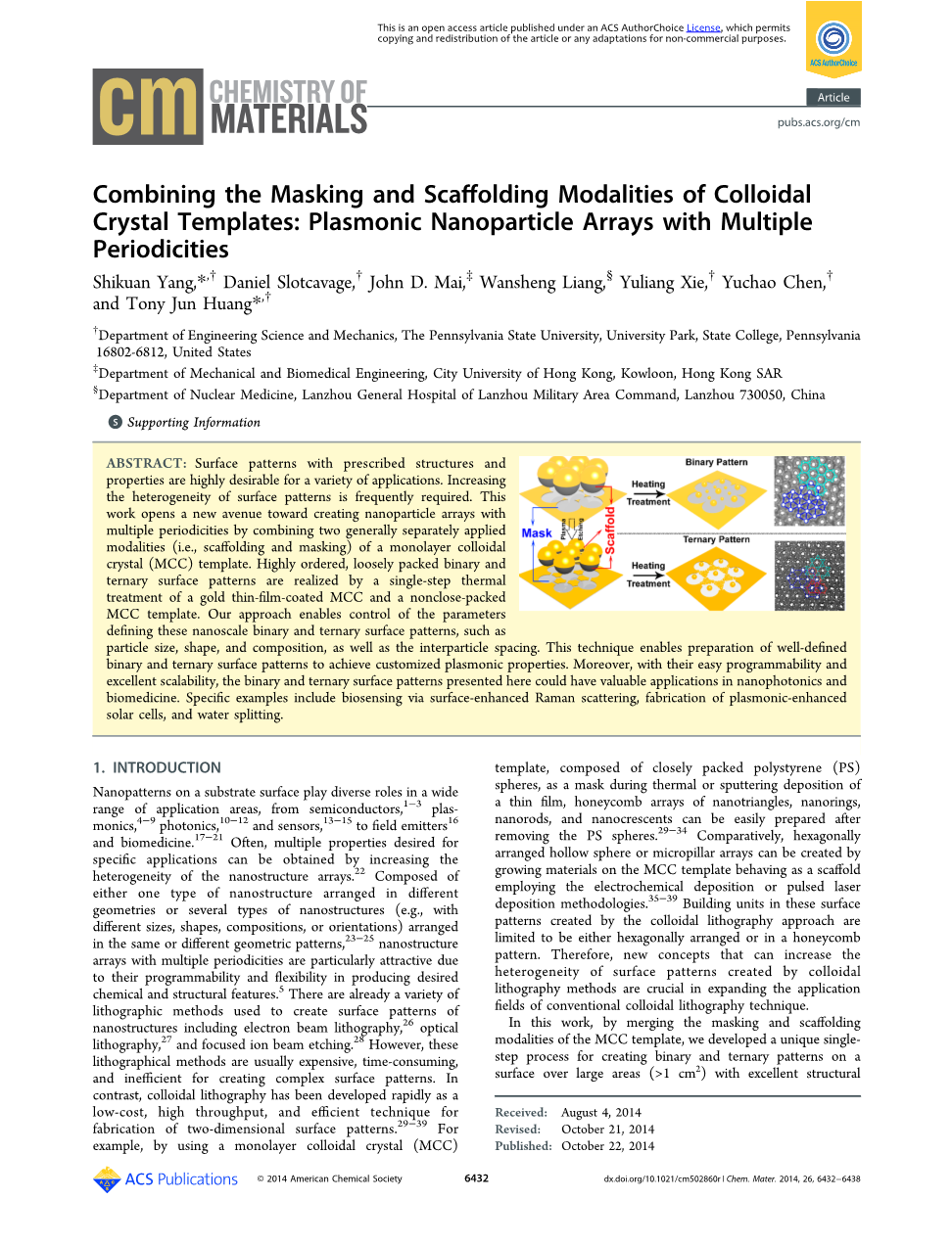 Nanopatterns on a substrate surface play diverse roles in a wide range of application areas, from semiconductors, plas- monics, photonics, and sensors, to field emitters16 and biomedicine. Often, multiple properties desired for specific applications can be obtained by increasing the heterogeneity of the nanostructure arrays. Composed of either one type of nanostructure arranged in different geometries or several types of nanostructures (e.g., with different sizes, shapes, compositions, or orientations) arranged in the same or different geometric patterns, nanostructure arrays with multiple periodicities are particularly attractive due to their programmability and flexibility in producing desired chemical and structural.There are already a variety of lithographic methods used to create surface patterns of nanostructures including electron beam lithography, optical lithography, and focused ion beam etching.However, these lithographical methods are usually expensive, time-consuming, and inefficient for creating complex surface patterns. In contrast, colloidal lithography has been developed rapidly as a low-cost, high throughput, and efficient technique for fabrication of two-dimensional surface patterns.For example, by using a monolayer colloidal crystal (MCC) template, composed of closely packed polystyrene (PS) spheres, as a mask during thermal or sputtering deposition of a thin film, honeycomb arrays of nanotriangles, nanorings, nanorods, and nanocrescents can be easily prepared after removing the PS spheres. Comparatively, hexagonally arranged hollow sphere or micropillar arrays can be created by growing materials on the MCC template behaving as a scaffold employing the electrochemical deposition or pulsed laser deposition methodologies.Building units in these surface patterns created by the colloidal lithography approach are limited to be either hexagonally arranged or in a honeycomb pattern. Therefore, new concepts that can increase the heterogeneity of surface patterns created by colloidal lithography methods are crucial in expanding the application fields of conventional colloidal lithography technique.