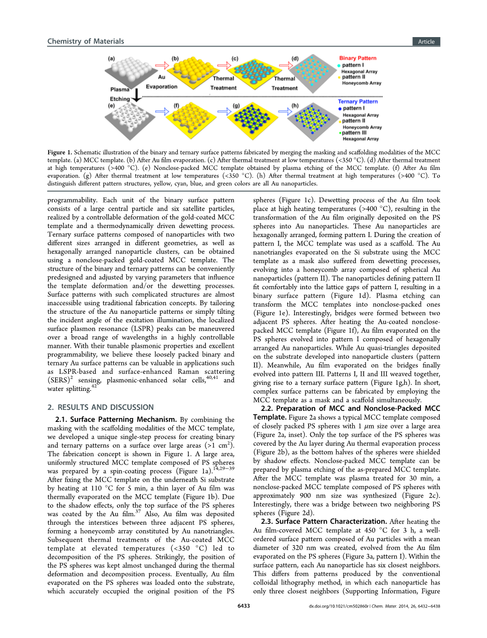 In this work, by merging the masking and scaffolding modalities of the MCC template, we developed a unique single- step process for creating binary and ternary patterns on a surface over large areas (gt;1 cm2) with excellent structural programmability. Each unit of the binary surface pattern consists of a large central particle and six satellite particles, realized by a controllable deformation of the gold-coated MCC template and a thermodynamically driven dewetting process. Ternary surface patterns composed of nanoparticles with two different sizes arranged in different geometries, as well as hexagonally arranged nanoparticle clusters, can be obtained using a nonclose-packed gold-coated MCC template. The structure of the binary and ternary patterns can be conveniently predesigned and adjusted by varying parameters that influence the template deformation and/or the dewetting processes. Surface patterns with such complicated structures are almost inaccessible using traditional fabrication concepts. By tailoring the structure of the Au nanoparticle patterns or simply tilting the incident angle of the excitation illumination, the localized surface plasmon resonance (LSPR) peaks can be maneuvered over a broad range of wavelengths in a highly controllable manner. With their tunable plasmonic properties and excellent programmability, we believe these loosely packed binary and ternary Au surface patterns can be valuable in applications such as LSPR-based and surface-enhanced Raman scattering (SERS) sensing, plasmonic-enhanced solar cells,and water splitting.
