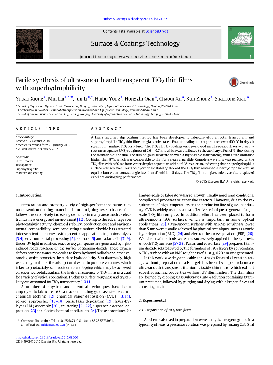 超级亲水性超光滑和透明TiO2薄膜的简单合成外文翻译资料