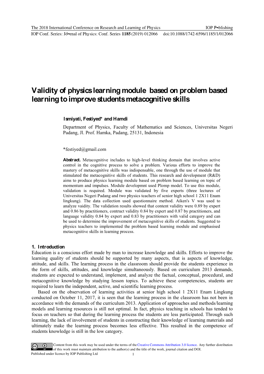 摘要:元认知包括对解决问题的认知过程进行主动控制的高级思维领域。提高元认知技能掌握的各种努力是必不可少的,一个是通过使用模块刺激学生的元认知技能。本研究开发的目标是基于动量和脉冲主题的基于问题学习的物理学习模块。模块开发采用了Plomp模型。要使用此模块,需要进行验证。模块由5位专家(巴东大学3次讲座和1 2X11 Enam lingkung高中2位物理教师)验证。数据收集采用问卷调查法。Aiken的V被用来分析有效性。验证结果表明,内容效度专家的为0.89和专业人员的效度为0.86,建构效度由专家的0.84和由专业人员的为0.87,语言有效性由专家的0.84和由专业人员的为0.83,可用于确定学生的元认知技能的提高。建议物理教师实施基于问题的学习模块,并在学习过程中强调元认知技能。