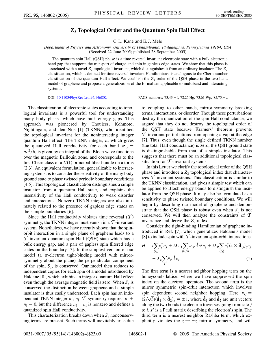 量子自旋霍尔(QSH)相是一个具有较大电子带隙的时间反演不变电子态,支持电荷和自旋在无隙边缘态的传输。我们证明了这一相区别于普通的绝缘体,与一个新的拓扑不变量有关。分类是为时间反转不变哈密顿量定义的,与量子霍尔效应的Chern数分类类似。我们建立了石墨烯双带模型中QSH相的序,并给出了适用于多波段和相互作用系统的形式