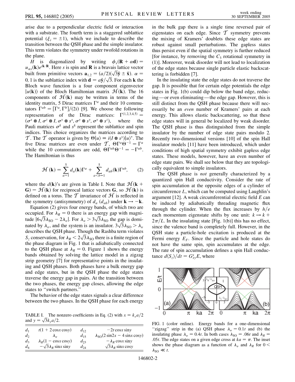 参考文献[10,11]中研究的自旋霍尔绝缘体模型是简单的绝缘体,当用式(2)表示时它们的哈密顿量为,因此在偶数子空间中且对于所有的k都有。参考文献[16]介绍了一个模型该模型确实显示出QSH效应。