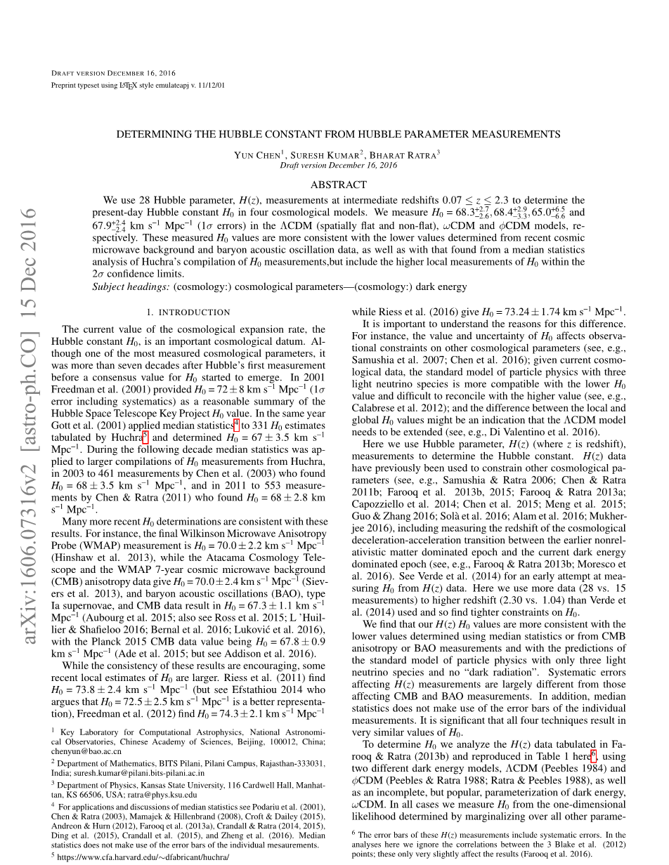 这里我们使用哈勃参数h(z)(其中z是红移),测量以确定哈勃常数。H(z)数据以前用于约束其他宇宙学参数(参见,如Samushia和Ratra于2006;Chen和Ratra 于2011b;Farooq等人于2013b,2015年;法鲁克和拉特拉2013a;Capozziello等人于2014;Chen等人于2015年;Meng等人于2015;郭于2016;索尔等人于2016年;Alam等人于2016年;Mukherjee于2016年),包括测量早期非相对论物质主导时代和当前暗能量主导时代之间的宇宙学减速加速过渡的红移(参见如Farooq和Ratra 2013b;Moresco等人于2016)。见Verde等人(2014)早期尝试从H(z)数据测量H0。在这里,我们比Verde等人(2.30对1.04)(2014)使用更多的数据(28对15次测量)来获得更高的红移,因此对H0的限制更为严格。